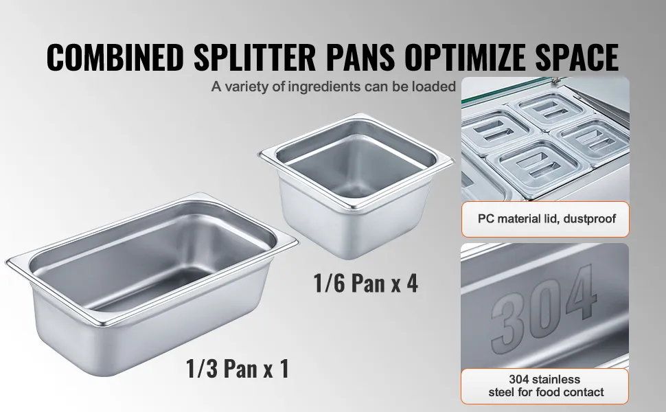 Modulares Tablettsystem: Unsere gekühlte Gewürzstation verfügt über 2 x 1/3 Pfannen und 4 x 1/6 Pfannen, was die Kapazität für eine flexible Nutzung erhöht. Herausnehmbare Trennwände helfen Ihnen, die Bereiche sinnvoll zu trennen, um Geschmacksübertragungen zu vermeiden und die Zutaten frisch zu halten. Hergestellt aus Edelstahl 304 und mit Behältern aus PC-Material mit dicht schließenden Deckeln zum Schutz vor Staub und Insekten. Sicher und zuverlässig. Je nach Bedarf können Sie zwischen verschiedenen Größen wählen, um Ihren unterschiedlichen Anforderungen an die Aufbewahrung und Präsentation von Lebensmitteln gerecht zu werden.