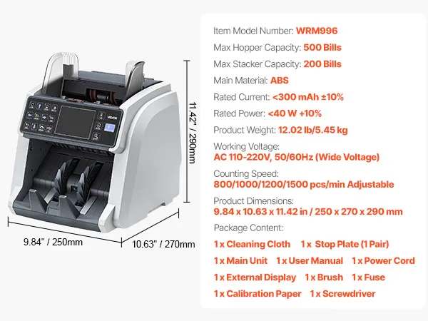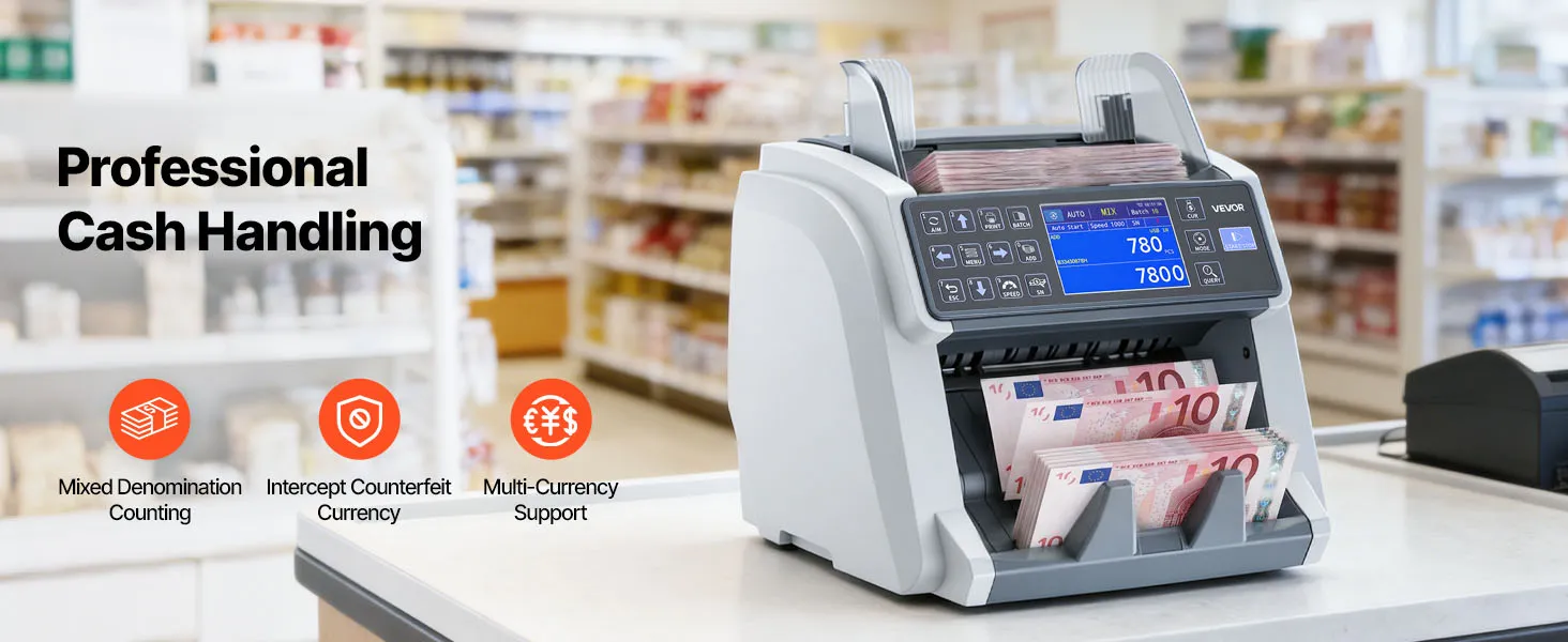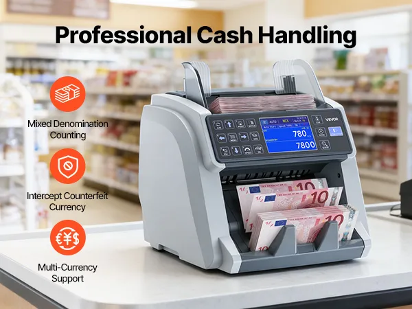 VEVOR Geldzählmaschine Banknotenzähler mit UV/MG/IR/DD/DBL/HLF/CHN Falschgelderkennung LED-Display, Wertzähler Unterstützt Mehrere Währungen & Gemischte Banknoten, Geldzähler Max. 1500 Banknoten/Min. VEVOR Geldzählmaschine Banknotenzähler mit UV/MG/IR/DD/DBL/HLF/CHN Falschgelderkennung LED-Display, Wertzähler Unterstützt Mehrere Währungen & Gemischte Banknoten, Geldzähler Max. 1500 Banknoten/Min.