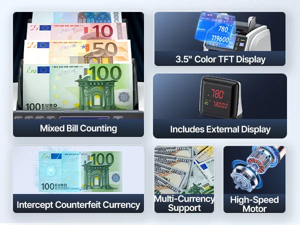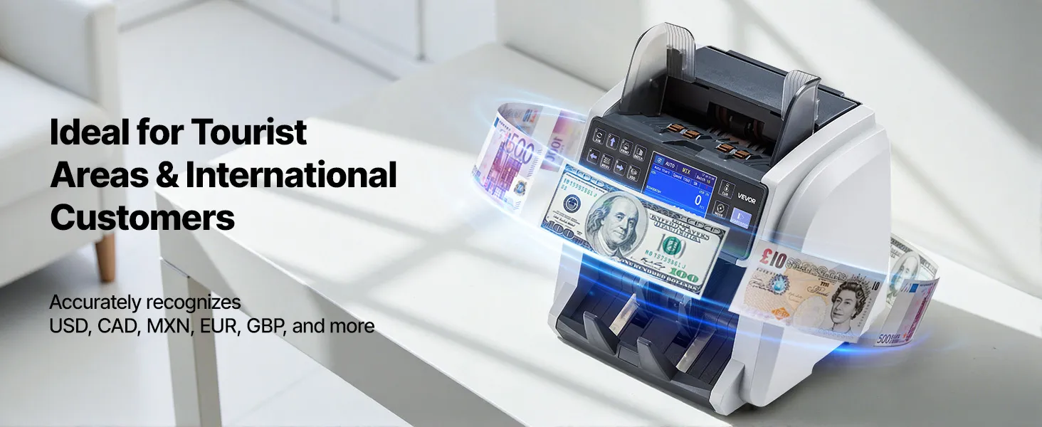 • Verarbeitet mehrere Währungen: Der Banknotenzähler unterstützt das Zählen und Erkennen gängiger Währungen wie USD, CAD, MXN, EUR und GBP. Gemischte Währungen können ohne manuelle Trennung gezählt werden, sodass ein Gerät für Unternehmen mit häufigen internationalen Bargeldtransaktionen ausreicht
