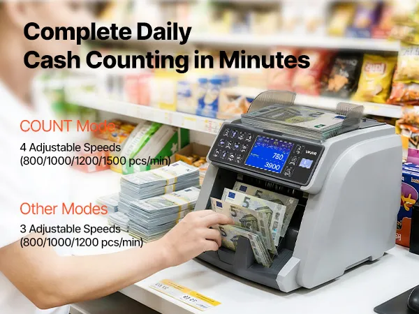 • Effizient in Spitzenzeiten: Der Einzugsbehälter fasst bis zu 500 Scheine, der Stapler stoppt bei 200 Scheinen. Dank vier einstellbarer Geschwindigkeiten (800/1000/1200/1500 Scheine/min) ist die tägliche Geldzählung in wenigen Minuten erledigt. Diese Geldzählmaschine eignet sich ideal für den Tagesabschluss, Nachtprüfungen und den Wochenendverkehr