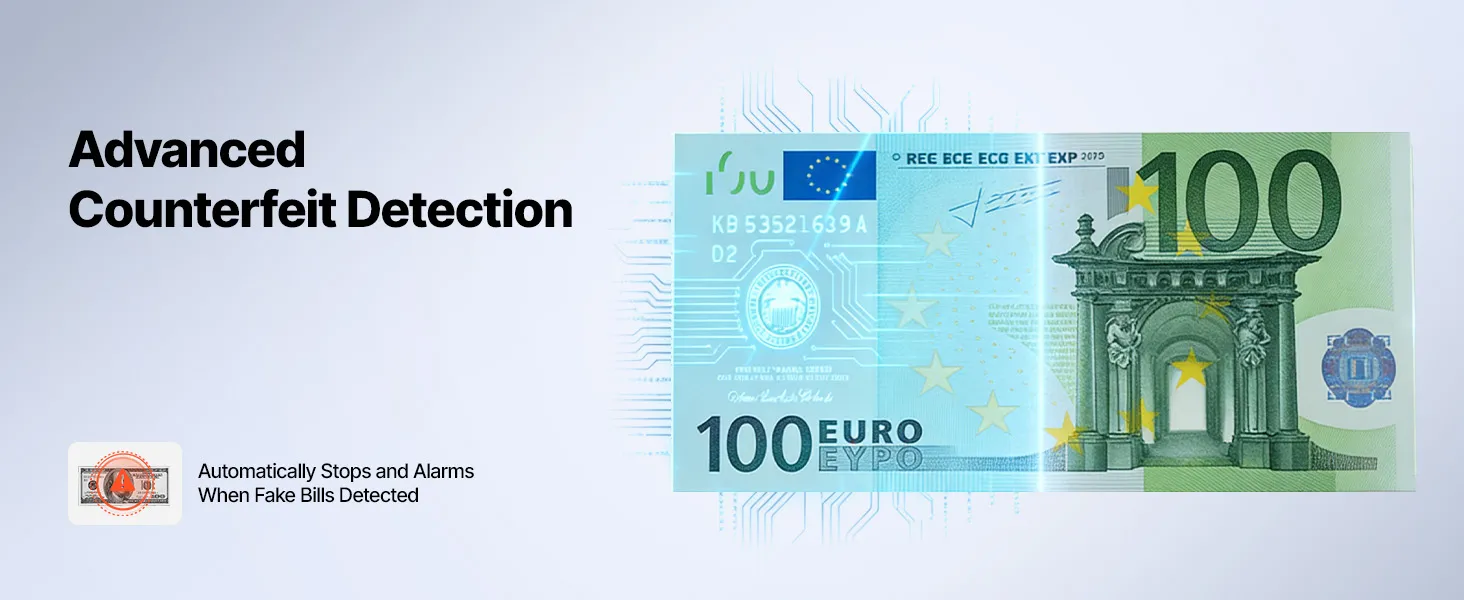 Stoppt den Betrieb automatisch und löst einen akustischen Alarm aus, wenn verdächtige Geldscheine erkannt werden.