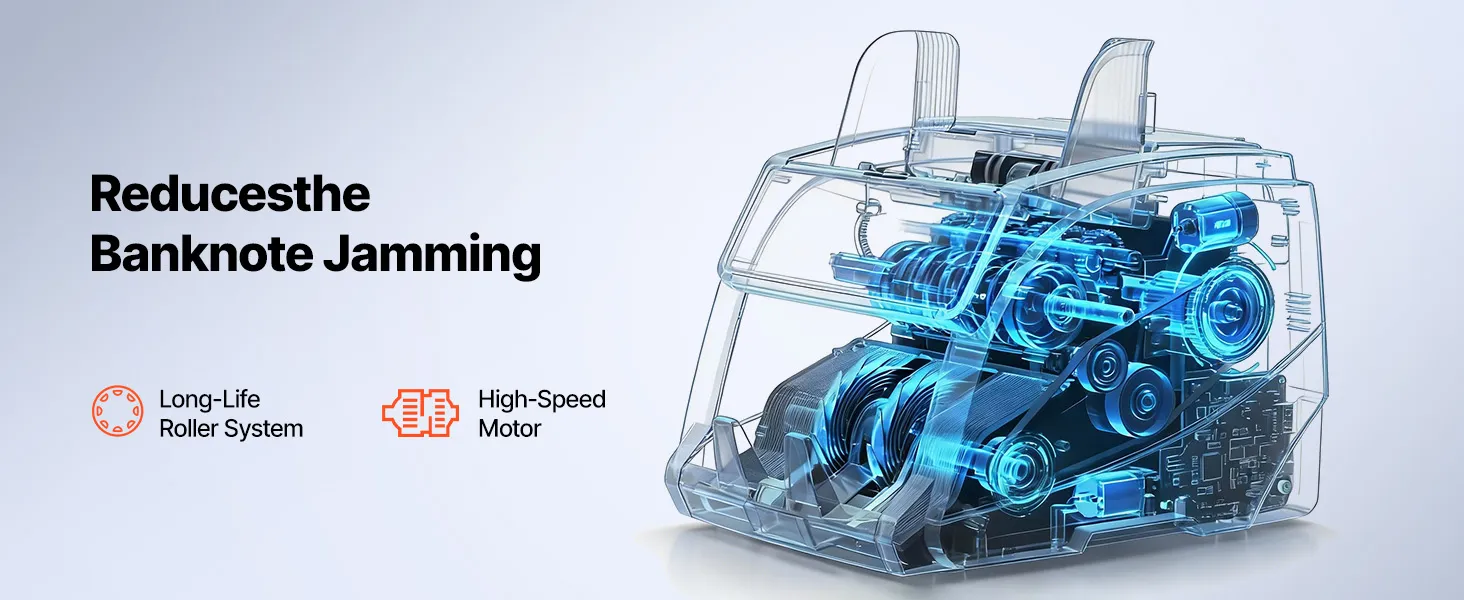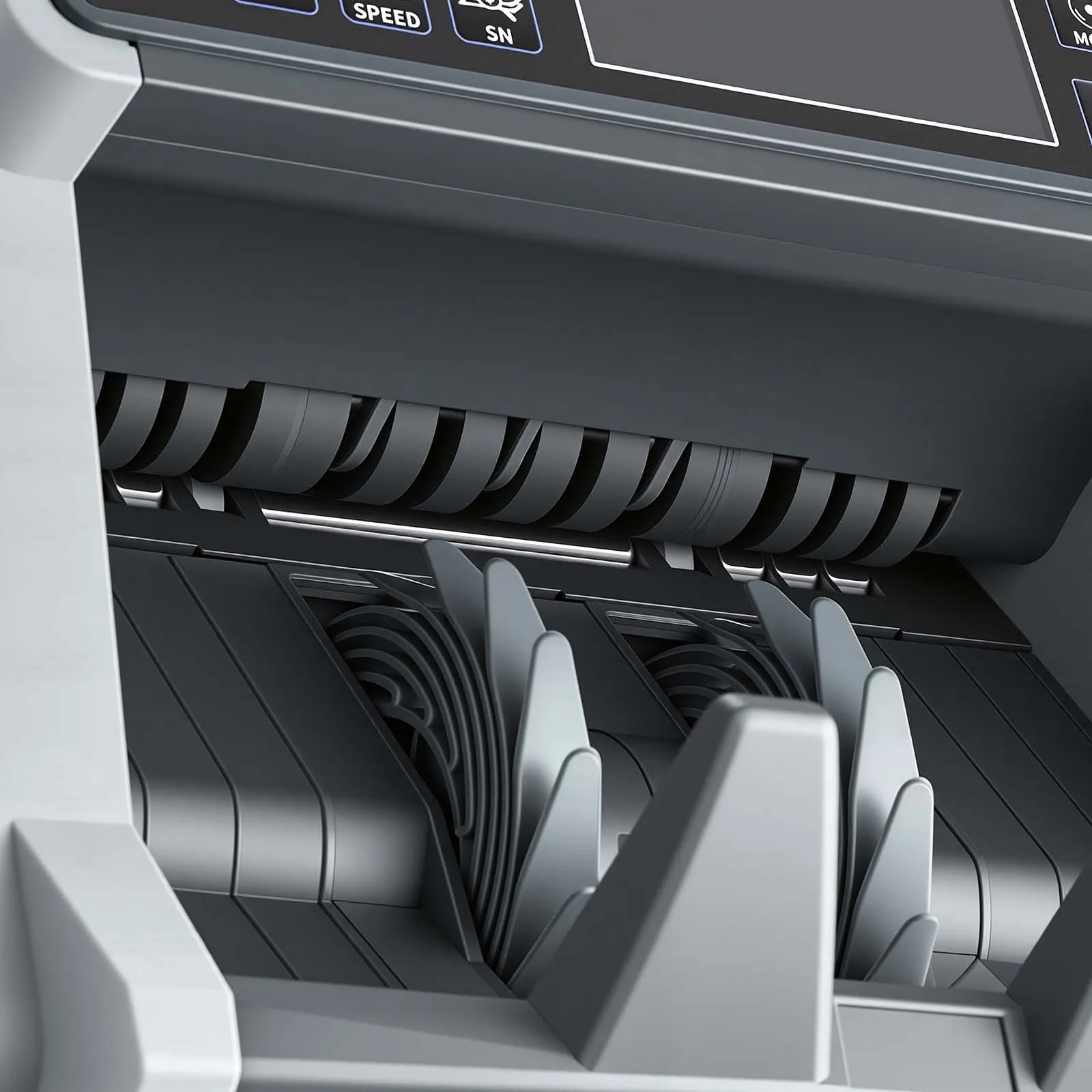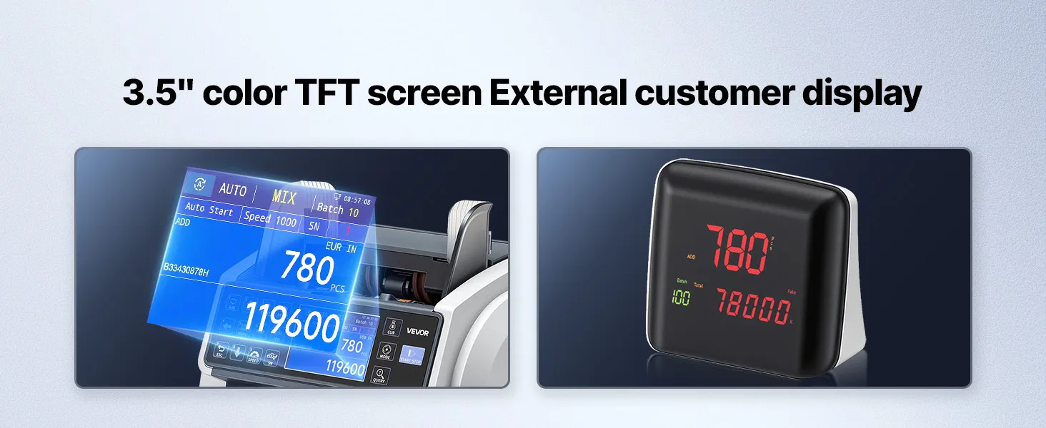 • Doppelanzeigesystem: Der Geldzähler verfügt über ein 3,5-Zoll-Farb-TFT-Display zur übersichtlichen Anzeige von Banknotenanzahl und -wert sowie ein externes Standard-Kundendisplay zur gemeinsamen Ansicht. Ein robustes Antriebssystem ermöglicht lange Betriebszeiten bei geringem Wartungsaufwand