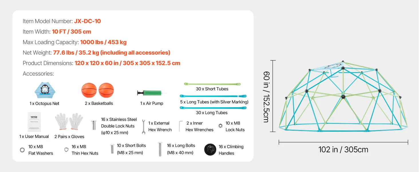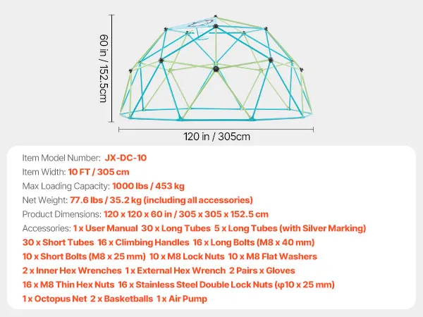 VEVOR Kletterkuppel geometrisches Klettergerüst (305 cm breit) mit Handschuhen & 2 Basketbällen, 453 kg belastbares Klettergerüst, Klettergerät für Kinder von 3 bis 10 Jahren Gartenspielzeug