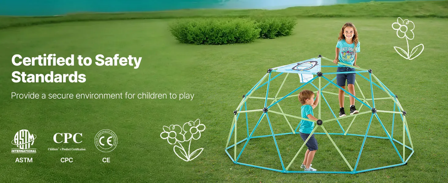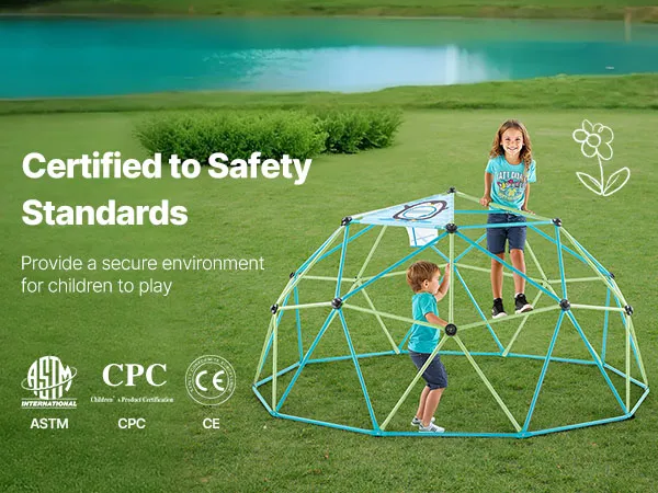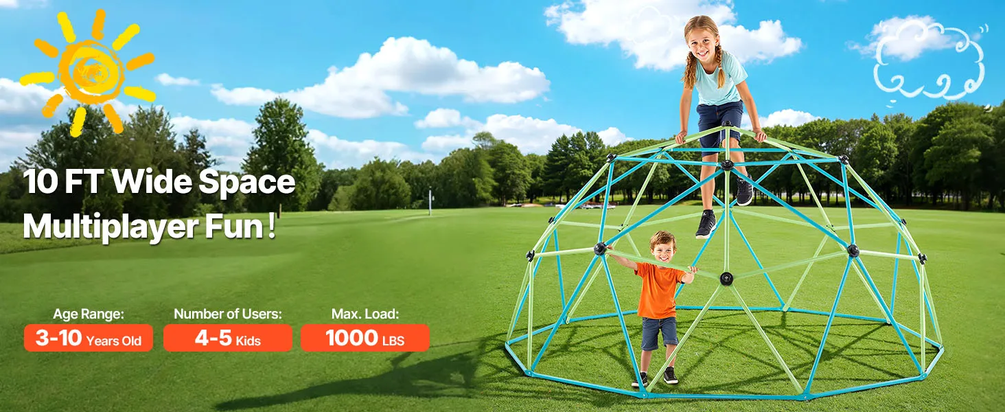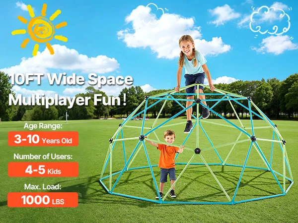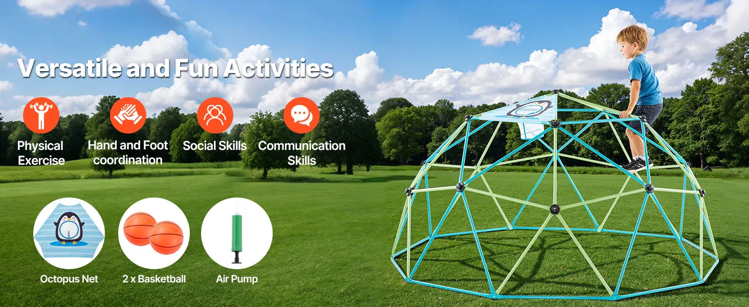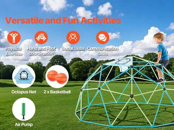Mit unserer 305 cm breiten Kletterkuppel können Kinder klettern, die Welt erkunden und stärker werden. Dank ihrer stabilen Struktur, rutschfesten Griffen, einer Tragkraft von 453 kg, zwei Basketbällen, einem Ballnetz und einer Luftpumpe fördert sie perfekt körperliche Kraft, Koordination, Kommunikation und soziale Kompetenz.