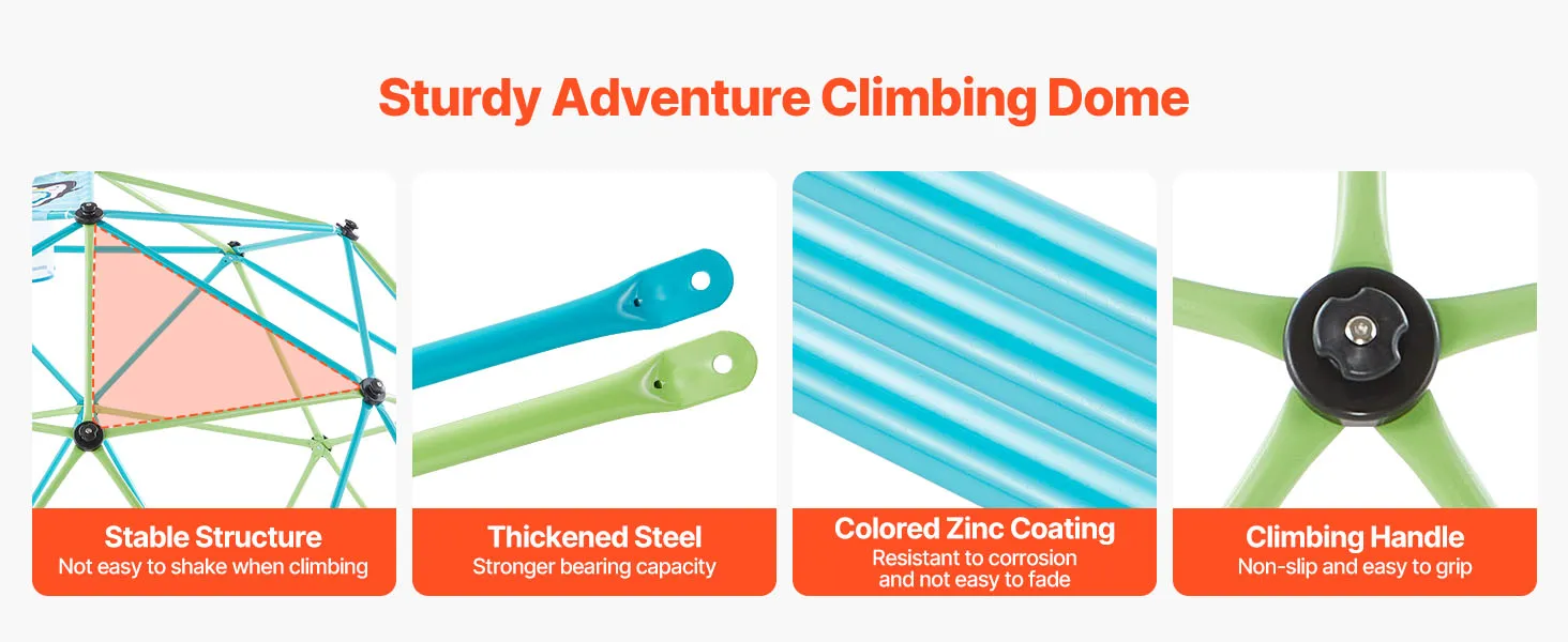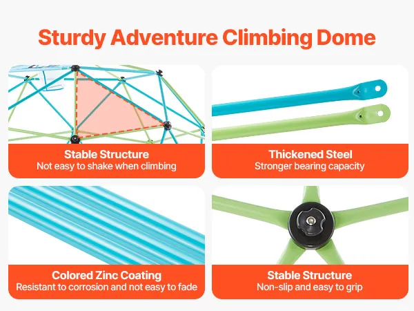 Unser Kletterturm mit Kuppel bietet sicheren und unterhaltsamen Kletterspaß. Seine stabile Dreiecksstruktur bleibt auch beim Spielen stabil. Verdickte Stahlrohre erhöhen die Tragfähigkeit, die farbenfrohe Zinkbeschichtung schützt vor Rost und Verblassen, während die rutschfesten Klettergriffe für sicheren Halt sorgen.