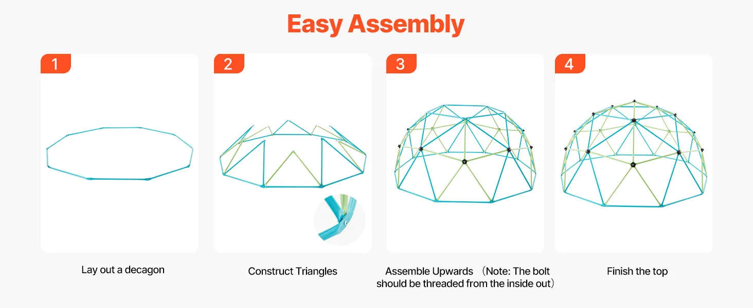 Unser geometrisches Klettergerät wird inklusive Handschuhen, Schraubenschlüsseln und einer ausführlichen Bedienungsanleitung geliefert. Es lässt sich von zwei Personen in nur wenigen Schritten aufbauen und bietet Ihren Kindern anschließend jede Menge Spaß.