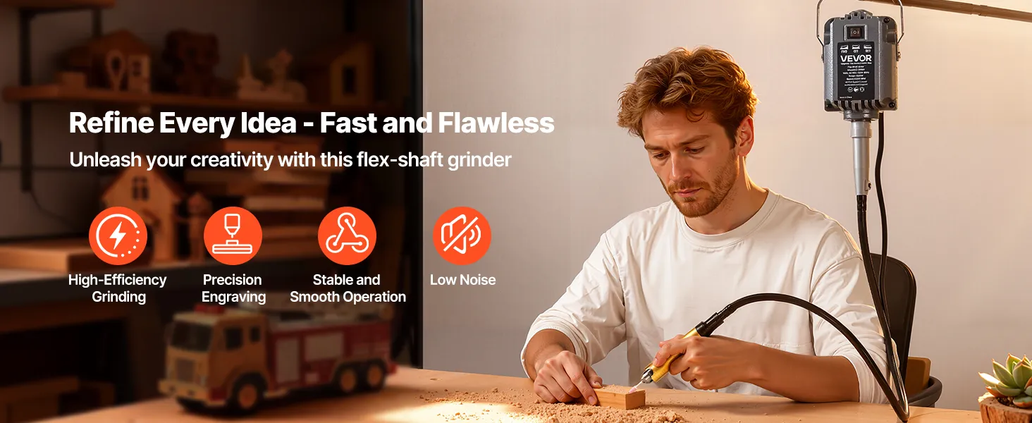 Diese VEVOR 1200W Flexwellenschleifmaschine erreicht Drehzahlen von bis zu 30.000 U/min und wird mit einem umfangreichen Zubehörset für Schleif-, Fräs-, Trenn- und Polierarbeiten geliefert. Das hochpräzise 3-Backen-Bohrfutter und die 99 cm lange Flexwelle sorgen für mehr Komfort und Flexibilität bei jedem Projekt.
