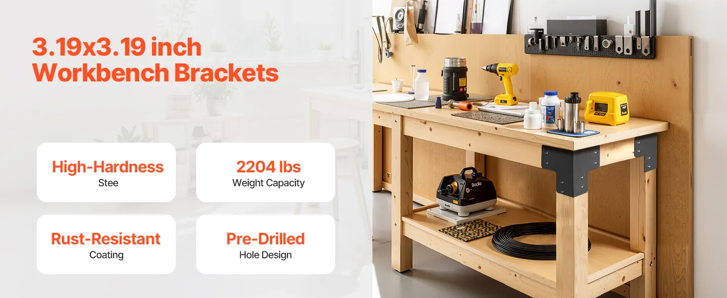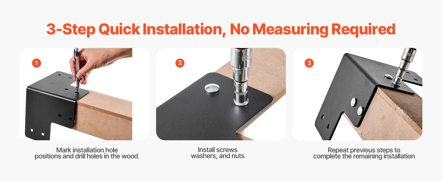 Robust und langlebig: Diese Werkbankhalterungen bestehen aus 4,1 mm dickem, hochfestem Stahl für außergewöhnliche Haltbarkeit. Jede Halterung trägt bis zu 1000 kg (abhängig von der Holzkapazität) und bietet so stabilen Halt für erhöhte Plattformen ohne Verformung.