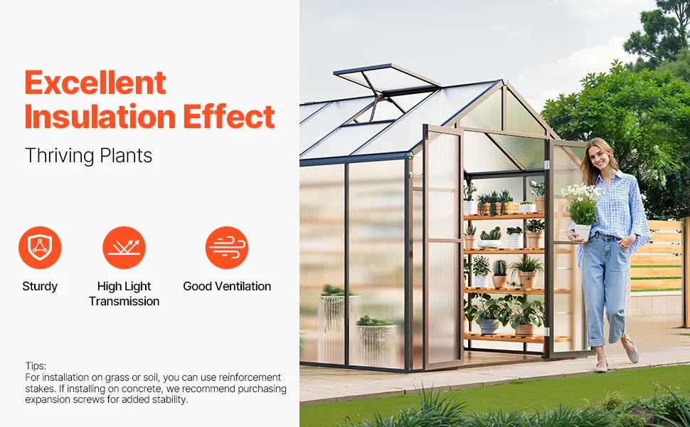 Dieses Gewächshaus aus Polycarbonat verfügt über einen robusten Rahmen aus Aluminiumlegierung und schlagfeste PC-Platten mit 89 % Lichtdurchlässigkeit für UV-Beständigkeit.