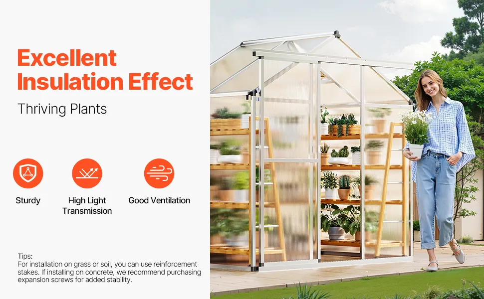 Langlebig und robust: Der Aluminiumrahmen des Polycarbonat-Gewächshauses ist korrosionsbeständig und die Polycarbonatplatten sind schlagfest, UV-beständig und behalten ihre Leistung im Temperaturbereich von -40 °C bis 125 °C bei und passen sich so verschiedenen Wetterbedingungen an. Mit Pfählen kann die Windbeständigkeit weiter verbessert werden.