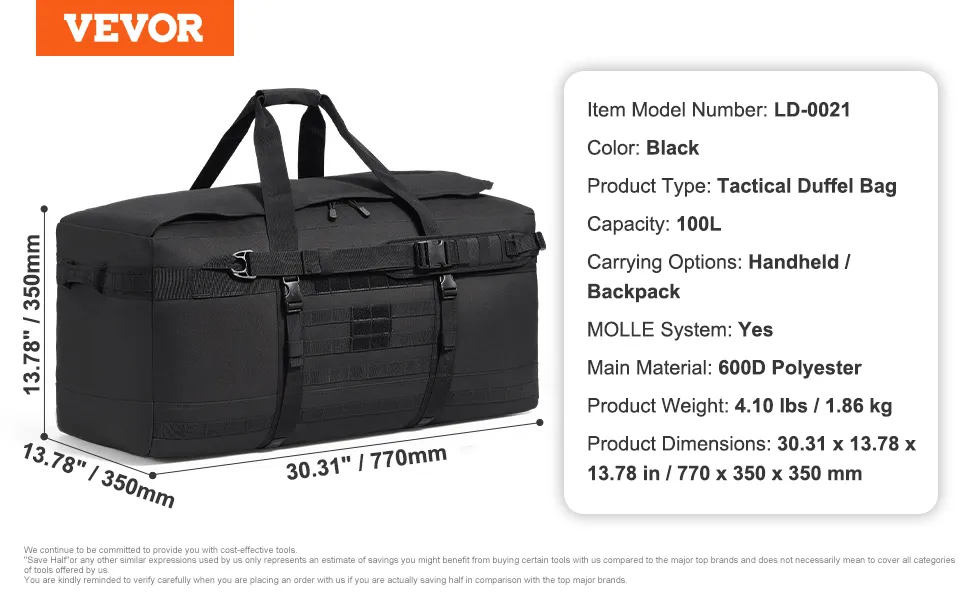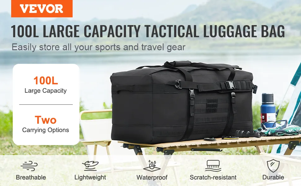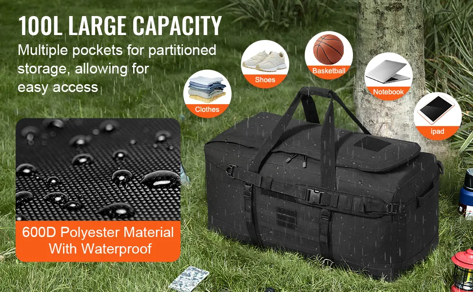 100 L großes Fassungsvermögen: Die taktische Reisetasche ist 30,31 Zoll (770 mm) lang, 13,78 Zoll (350 mm) breit und 13,78 Zoll (350 mm) hoch und bietet ein Gesamtfassungsvermögen von 100 L. Sie bietet problemlos Platz für Fitnessgeräte, Trainingsausrüstung, Kleidung, Schuhe, Basketbälle und andere Gegenstände, die Sie für Sport und Reisen benötigen, und erfüllt so perfekt Ihre Reiseanforderungen.