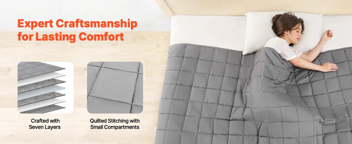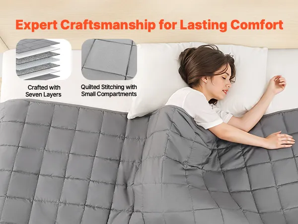Langlebige Verarbeitung: Dank der siebenlagigen Struktur und Stepptechnik sorgt unsere schwere Gewichtsdecke für eine gleichmäßige Gewichtsverteilung und verhindert Verklumpen. Acht Befestigungsschlaufen sorgen für Stabilität während der Nacht.