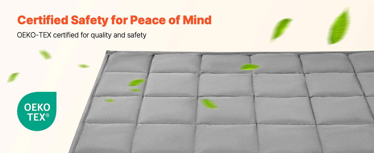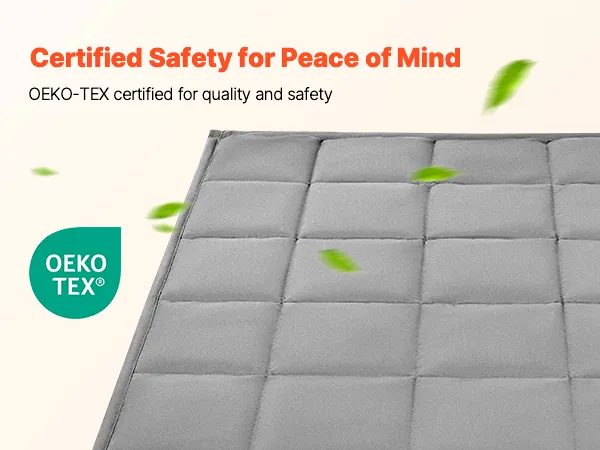 Unsere OEKO-TEX-zertifizierte Gewichtsdecke wird ohne Schadstoffe hergestellt und ist somit zuverlässig und verantwortungsvoll produziert. Wir möchten Ihnen ein komfortableres Erlebnis bieten.