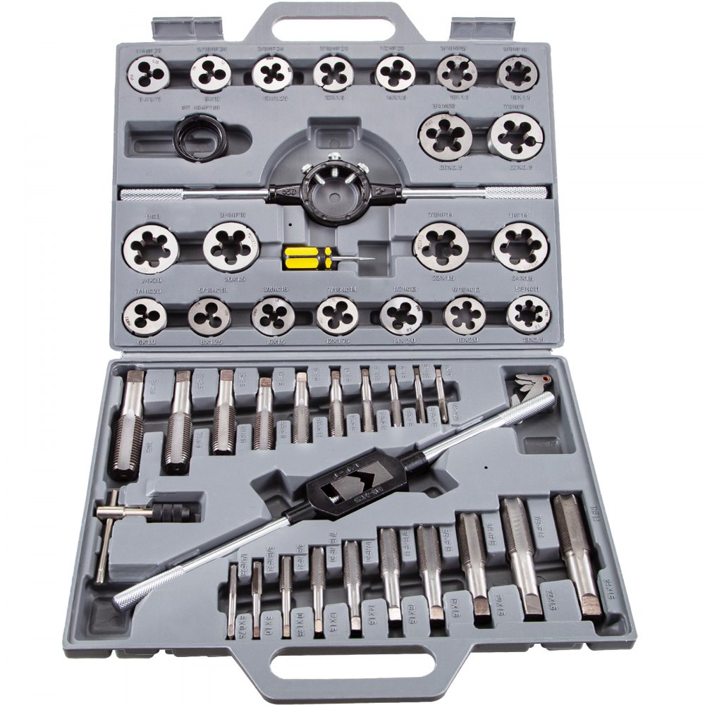 Der 45-teilige Gewindebohrersatz besteht aus Kohlenstoffstahl. Es enthält 20 Gewindebohrer und 20 Matrizen. Sie variieren von 3/4 Zoll bis 7,5 cm. Diese konischen Gewindebohrer und Matrizen sind die am häufigsten verwendeten Stile. Wir können sie verwenden, um neues Material zu schneiden oder leicht beschädigte Fäden zu jagen. Diese Gewindebohrer und Matrizen schneiden Weichkohlenstoff und legierten Stahl, Edelstahl, Gusseisen, Aluminium, Messing und Bronze.