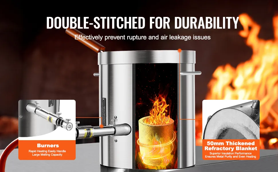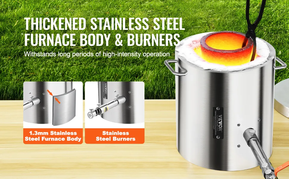 Das verstärkte Gehäuse und die Brenner des Schmelzofensets aus rostfreiem Stahl sind widerstandsfähiger und halten hohen Temperaturen und intensiver Nutzung über lange Zeiträume stand.