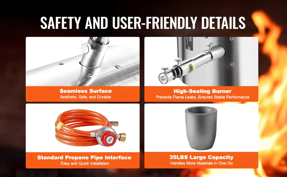 Sichere & zuverlässige Details: Der Ofenkörper hat keine sichtbaren Schweißnähte, was ihm ein sauberes und elegantes Aussehen verleiht und gleichzeitig für Sicherheit sorgt. Die Brennerhülse verfügt über eine Flanschverbindung und der Propangasschlauch über Standard-Gewindeverbindungen, die ein Austreten des Feuers wirksam verhindern. Genießen Sie ein sicheres und müheloses Schmelzerlebnis mit unserem Propan-Metallschmelzofen.