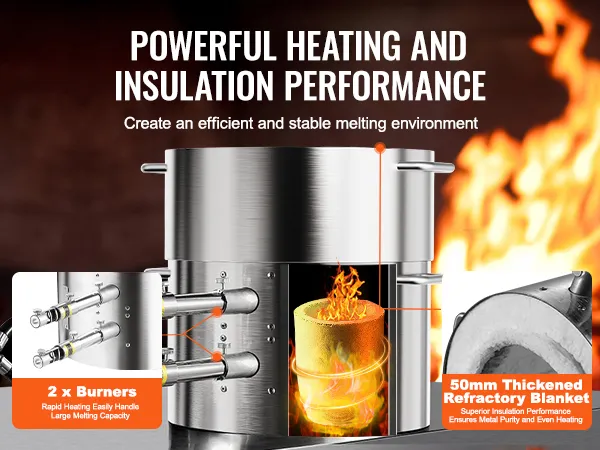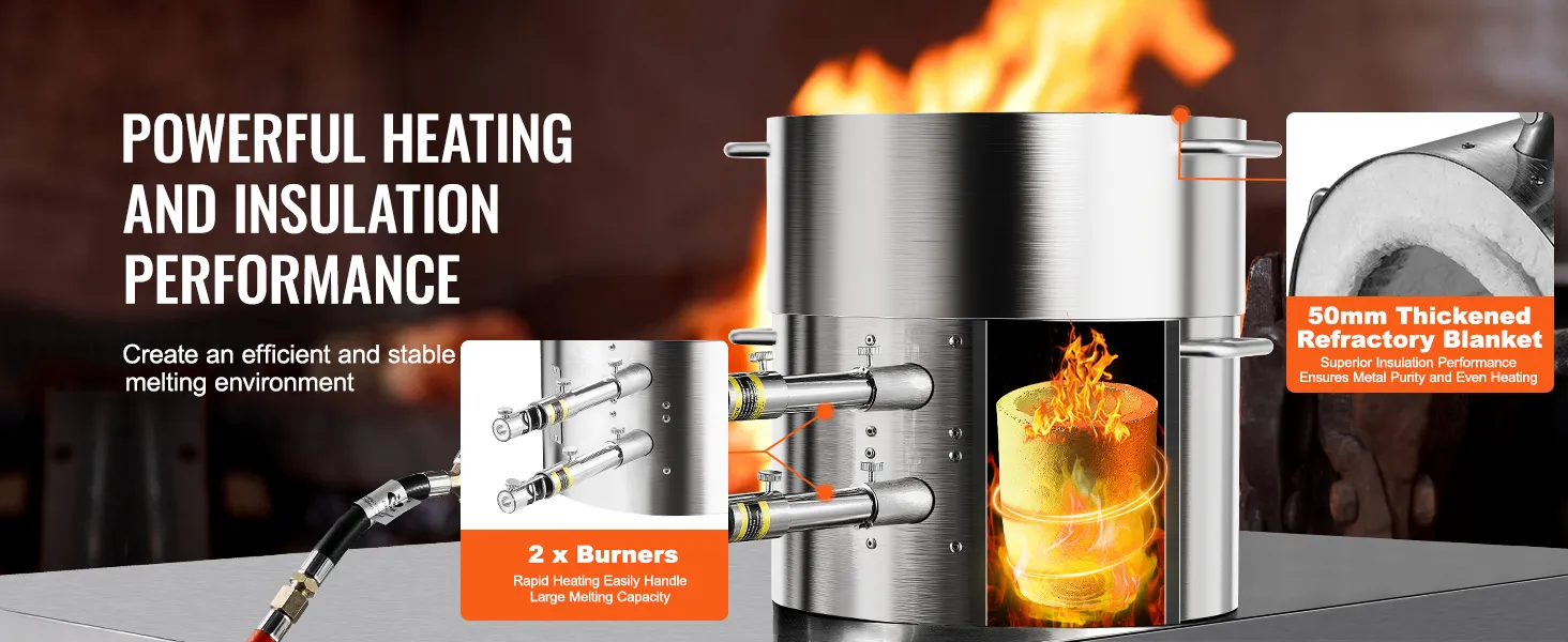 The thick, refractory lining provides excellent insulation, and the twin burners deliver high heat output. Our metal melting furnace kit creates a highly efficient and stable melting environment for your projects.