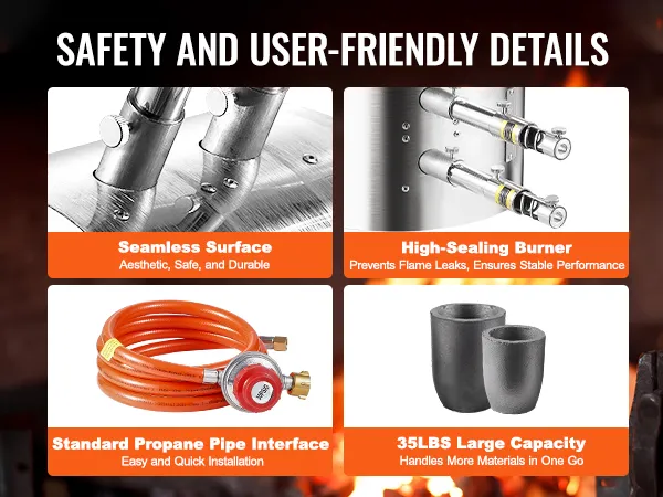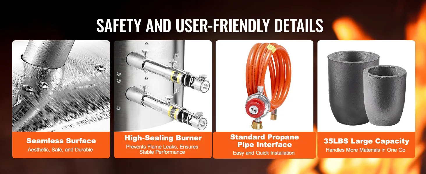 Safe & reliable details: The furnace body is free of visible welds, giving it a clean and elegant appearance while ensuring safety. The burner sleeve uses a flanged connection, and the propane hose has standard threaded connections, effectively preventing flame leakage. Enjoy a safe and effortless melting experience with our propane furnace for melting metal.