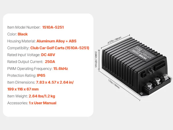Our golf cart controller is compatible with the Club Car 1510A-5251 models and is easy to use. With a 48V input and 250A output, IP65 waterproof rating, and an aluminum alloy and ABS housing, it ensures worry-free driving. Fast start-up and a 15.6 kHz high-frequency response enhance efficiency and performance.