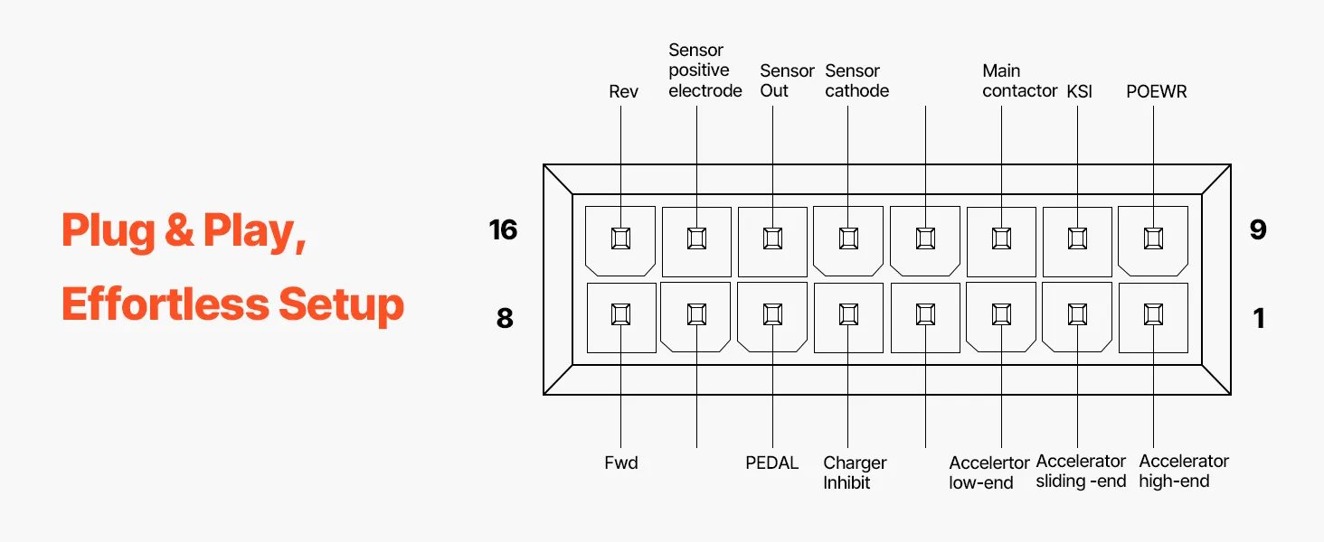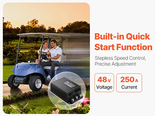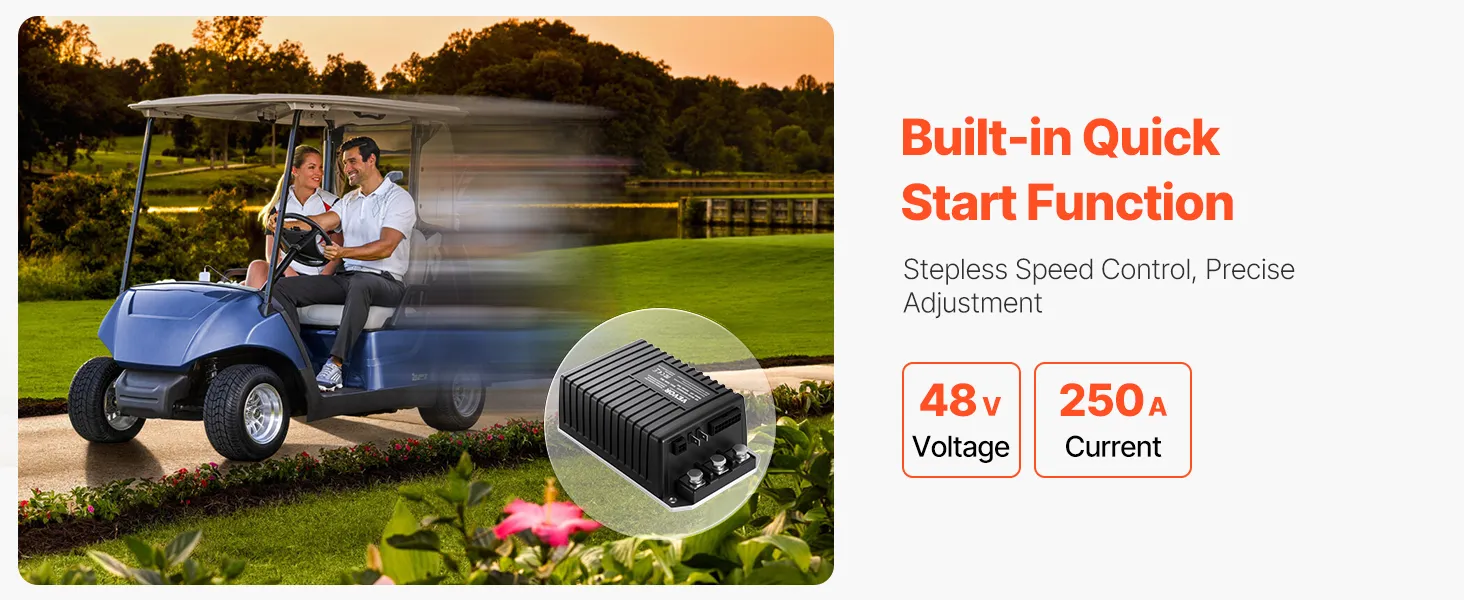 This motor controller for golf carts features a quick-start function for instant throttle response and seamless acceleration. With a 48V input and 250A output, it ensures smooth, efficient driving and precise speed control.