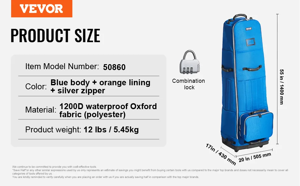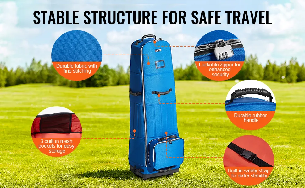 Diese robuste Golfreisetasche aus wetterfestem 1200D Oxford-Gewebe bietet hervorragende Stoßfestigkeit und Wasserfestigkeit. Die Tasche verfügt über eine große Außentasche mit Doppelreißverschluss (abnehmbarer Schuhbeutel) mit Außenreißverschlüssen. Diese Reißverschlüsse sind abschließbar und ideal für die Aufbewahrung von zusätzlichem Golfzubehör oder Gegenständen Ihrer Wahl. Interne Sicherheitsgurte sorgen außerdem dafür, dass Ihre Schläger sicher verstaut sind.