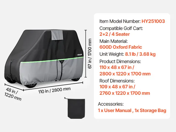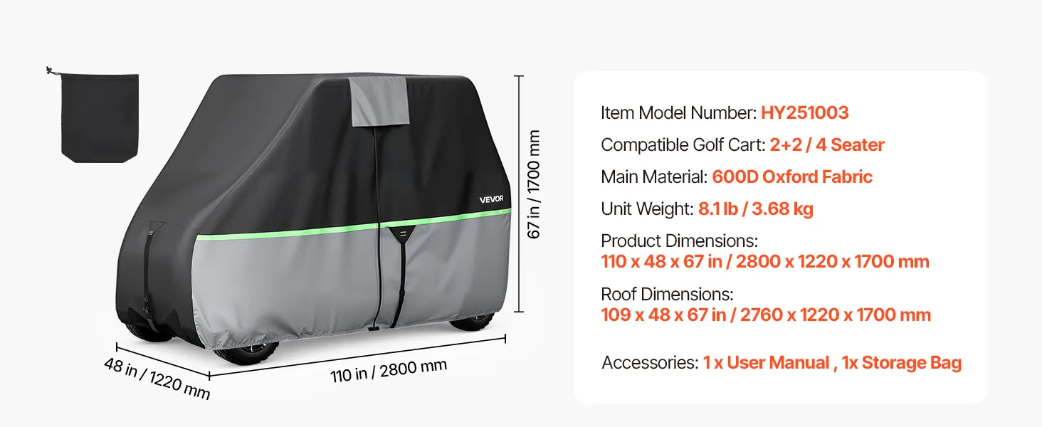 • Passend für 2+2/4-Sitzer-Golfwagen: Diese Abdeckung für Golfwagen passt auf 2+2-/4-Sitzer-Modelle, z. B. von Yamaha, EZGO, Club Car und Honda. Geeignet für Dachmaße bis 110 x 48 x 66,9 Zoll (280 x 122 x 170 cm) – für einen sauberen, passgenauen Look im Außenbereich