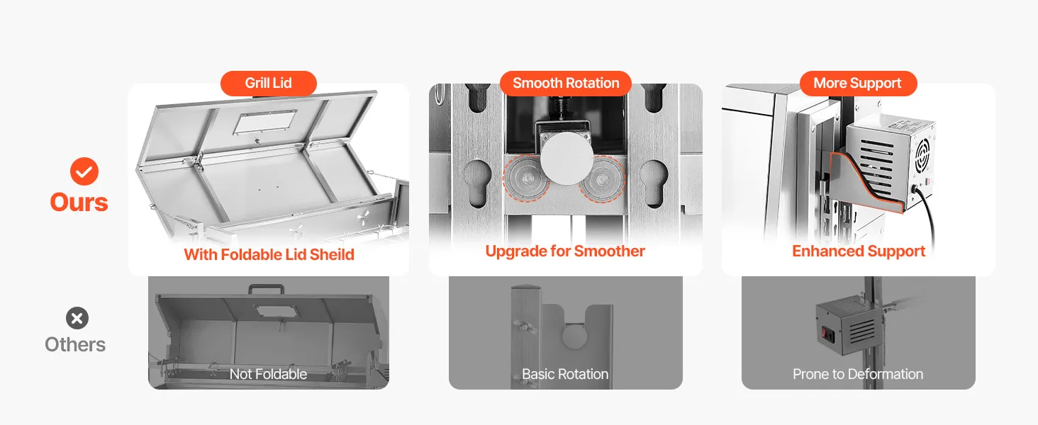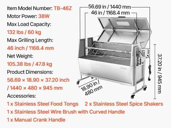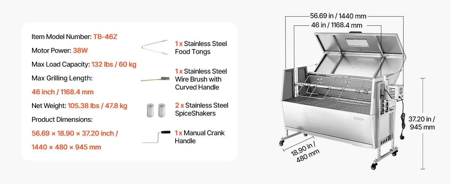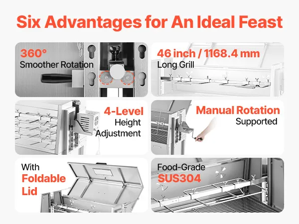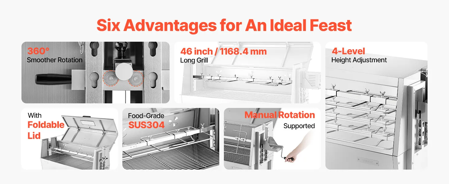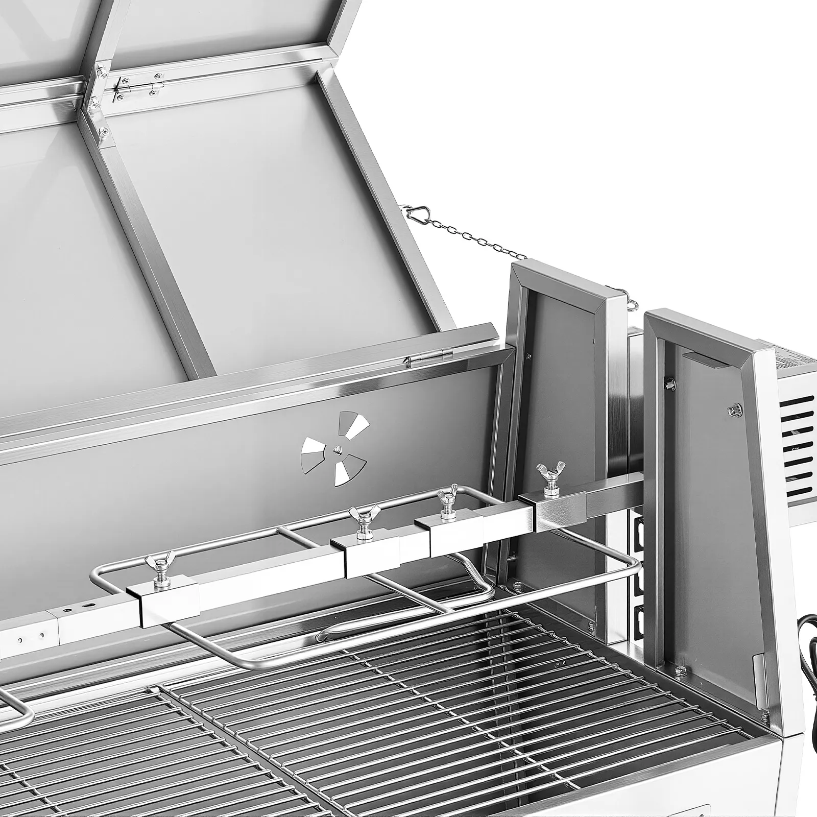 Dieser 1168,4 mm (46 Zoll) große Drehspießgrill mit 38-Watt-Motor und Kühlventilator dreht sich sanft um 360° und kann bis zu 60 kg (132 lbs) Schweine- oder Lammfleisch zubereiten. Vier einstellbare Höhen ermöglichen eine präzise Hitzeregulierung, die Gabeln aus Edelstahl SUS304 und die Edelstahlkonstruktion garantieren Langlebigkeit und einfache Reinigung.
