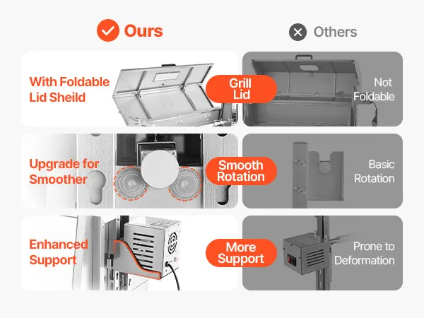 Hergestellt aus robustem Edelstahl SUS304, sind alle Teile, die mit Lebensmitteln in Berührung kommen, rostbeständig und gewährleisten problemloses Grillen für eine lange Lebensdauer.