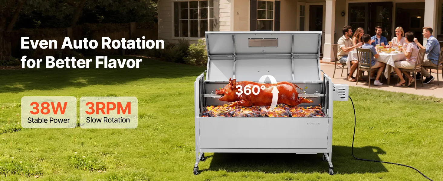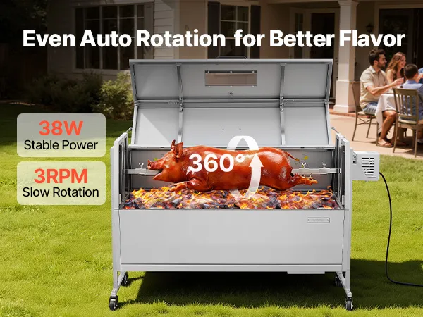 Müheloses Drehen: Mit einem 38-W-Motor und 3 Umdrehungen pro Minute sorgt dieser Spanferkelgrill dank doppelter Lager für eine gleichmäßige und ruhige Bewegung bei minimaler Motorbelastung. Der verbesserte Lüfter gewährleistet eine konstante Leistung ohne Überhitzung