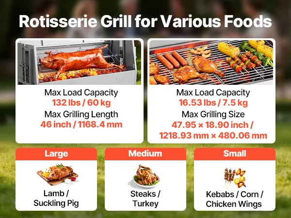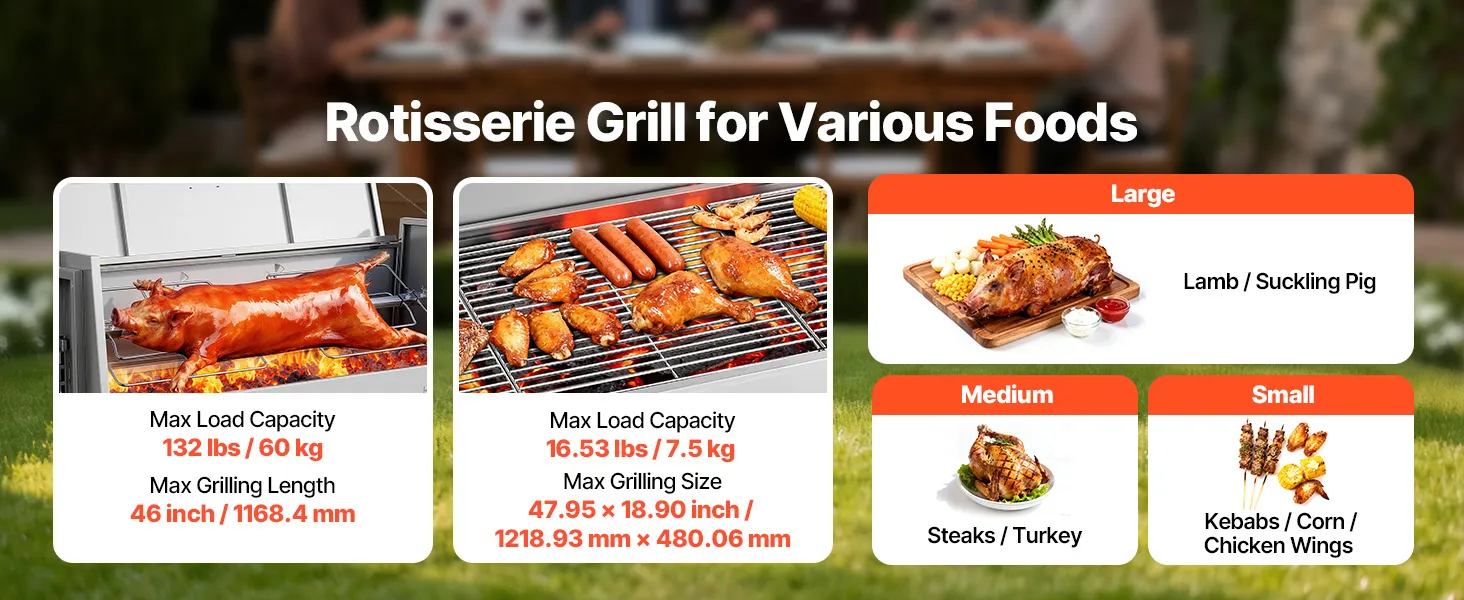Maximale Belastbarkeit: Der 1168,4 mm (46 Zoll) große Spanferkelgrill mit einer Grillfläche von 1370 x 550 mm (53,94 x 21,65 Zoll) trägt bis zu 60 kg (132 lbs) und eignet sich für Schweine, Lamm, Pute oder gemischtes Fleisch mit Gemüse – für ein beeindruckendes und unkompliziertes Grillfest im Freien