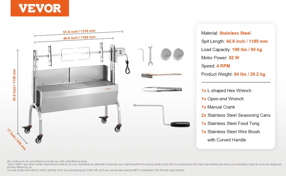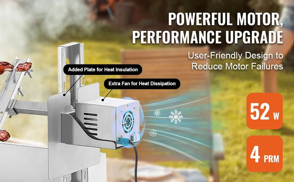 Es ist mit einem leistungsstarken 52-Watt-Motor ausgestattet, der den Drehspieß mühelos mit 4 Umdrehungen pro Minute dreht. Im Lieferumfang enthalten sind außerdem eine Wärmeisolierungsplatte und ein Ventilator, die für eine hervorragende Isolierung und Kühlung sorgen.