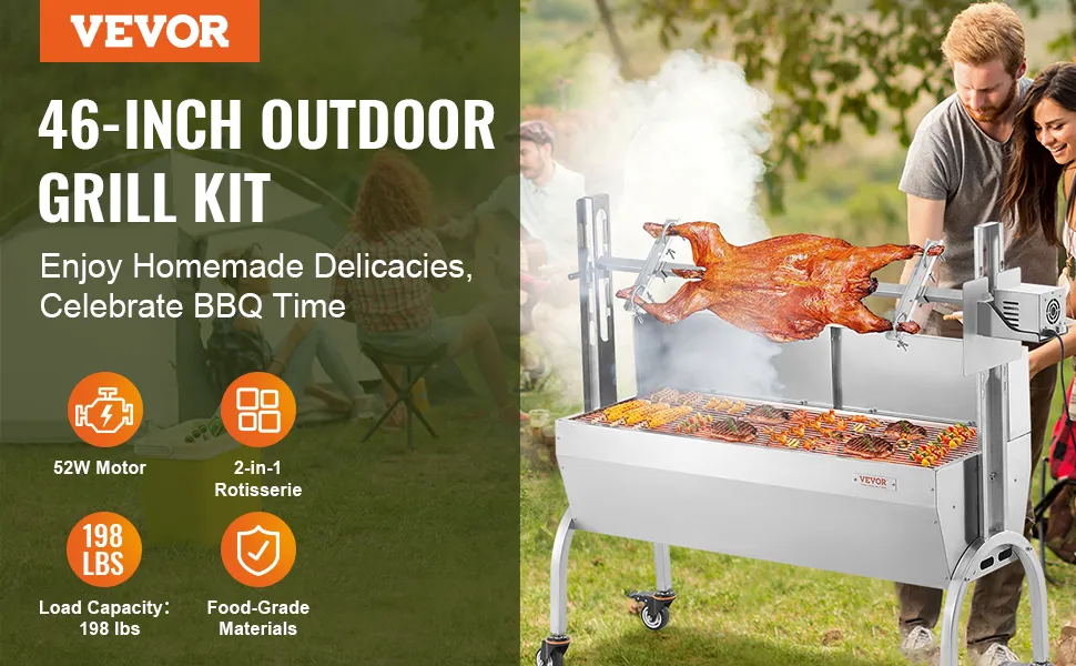 Hohe Tragkraft: Dieser Schweinegrill hat eine Gesamttragkraft von 198 lbs (90 kg), mit einem Grillnetz, das 132 lbs (60 kg) tragen kann, und wird mit einer automatischen Grillgabel geliefert. Der 46-Zoll-Grill (1185 mm) bietet reichlich Platz für Ihr Grillgut und ermöglicht das gleichzeitige Grillen verschiedener Fleischsorten, sodass Sie und Ihre Familie den unvergleichlichen Rauchgeschmack genießen können. Bitte beachten Sie, dass die tatsächliche maximale Tragkraft nach der Zubereitung 66 lbs (30 kg) Nettogewicht beträgt.