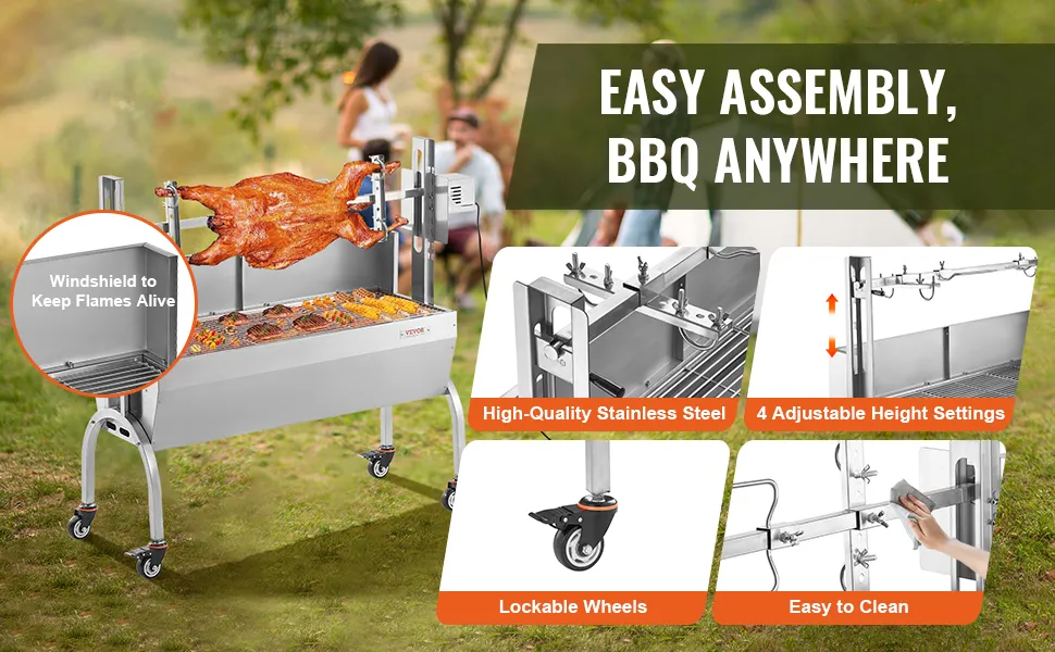 Benutzerfreundliches Design: Der Drehspießgrill aus Edelstahl ist mit 4 abnehmbaren und feststellbaren Rädern ausgestattet, die den Transport erleichtern und für mehr Stabilität beim Grillen sorgen. Außerdem enthält er 2 Gewürzflaschen, eine Zange und eine Bürste, was ihn zum perfekten Grill für offene Flammen und Drehspießgrillen macht. Der Windschutz mit Metallrand sorgt dafür, dass die Flamme nicht ausgeht, was den Gebrauch komfortabler macht.