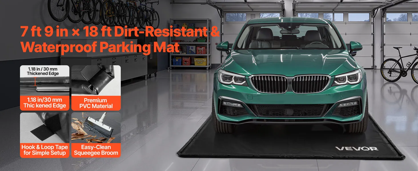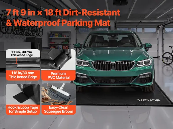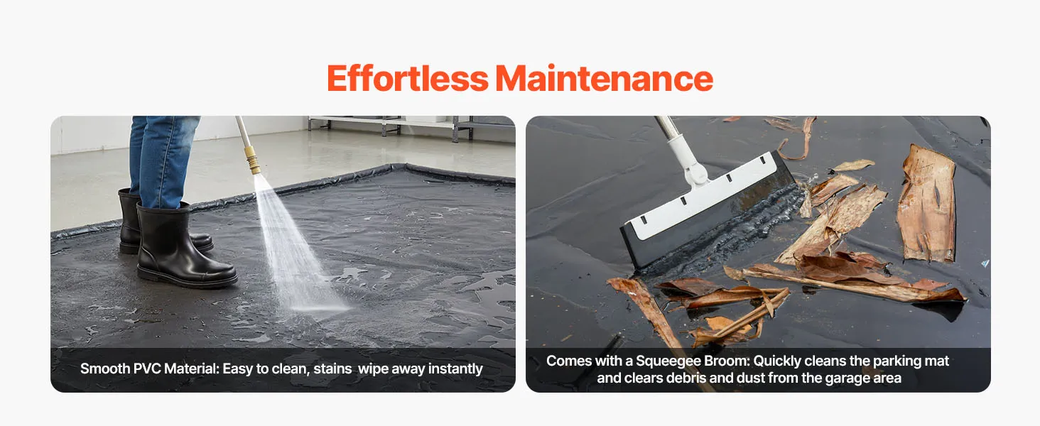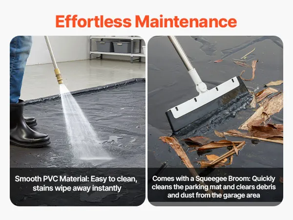 Bequeme Reinigung: Die Autogaragenmatte hat eine glatte Oberfläche, die Flecken einfach mit einem Wischtuch entfernt. Sie wird mit einem Abziehbesen geliefert, mit dem sich Schlamm und Schmutz schnell von der Matte entfernen lassen, was die Reinigungseffizienz verbessert und die Garage sauber und ordentlich hält