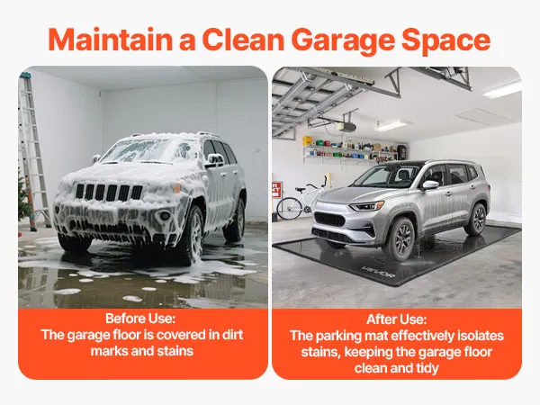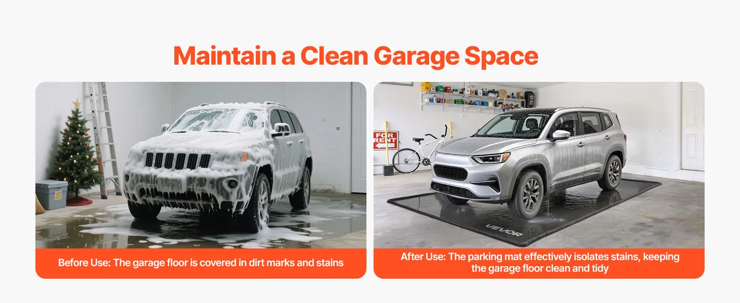 Vor der Verwendung der Garagenmatte war der Garagenboden voller Schmutzflecken und Flecken. Nach der Verwendung isoliert die Matte Flecken effektiv und hält den Garagenboden sauber und ordentlich. Dank seiner wasserfesten und schmutzabweisenden Eigenschaften bleibt die Garage stets sauber.