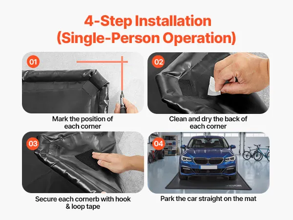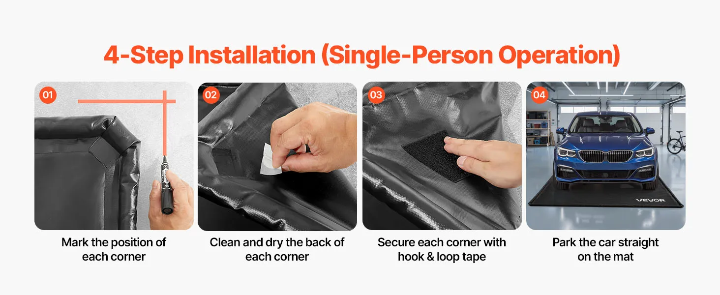 Die Autogaragenmatte verfügt über ein Klettband-Design, das die Installation einfach und schnell macht. Sie kann problemlos von einer Person ohne komplexe Werkzeuge oder Hilfe installiert werden. Dies löst die Unannehmlichkeiten für Benutzer bei der Installation von Parkmatten.
