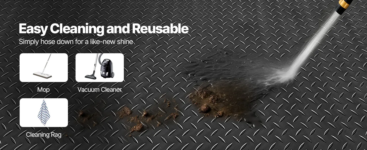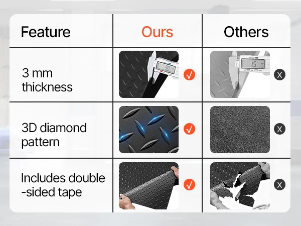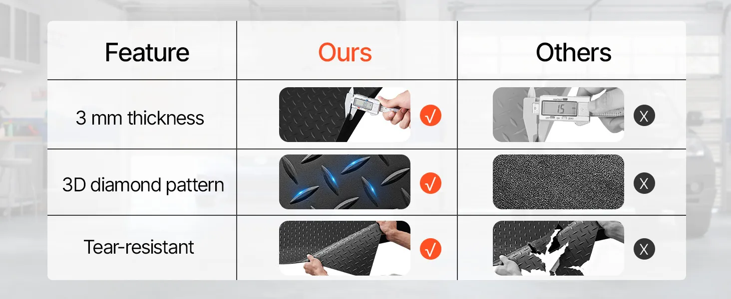 Hochleistungs-SBR-Gummi: Diese Garagenbodenmatte besteht aus 3 mm dickem Hochleistungs-SBR-Gummi und bietet hervorragende Verschleiß- und Druckfestigkeit. Sie hält Anhängern, LKWs und schweren Fahrzeugen stand, ohne sich zu verformen, und gewährleistet so eine lange Lebensdauer.