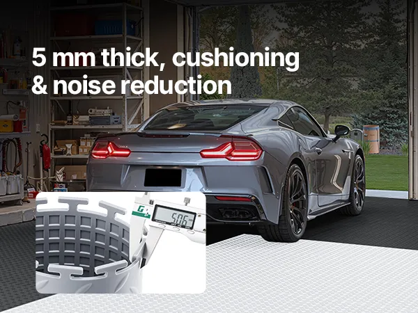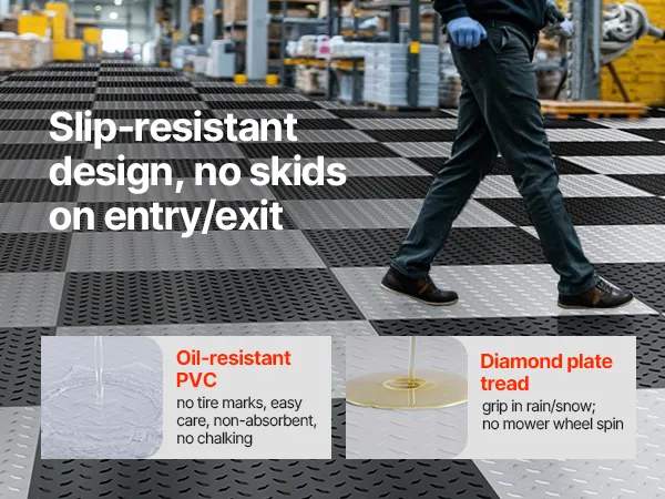 Robuste Konstruktion: Die Oberfläche der Diamantplatte erhöht die Reibung und reduziert so das Verrutschen. 5 mm dicke PVC-Werkstattbodenfliesen sind reißfest, wasser- und ölbeständig und gewährleisten so eine lang anhaltende Leistung