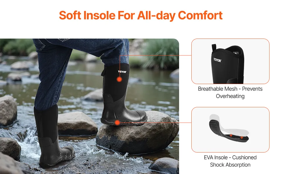Die EVA-Innensohle fühlt sich weich und bequem an, dämpft Stöße effektiv und reduziert die Ermüdung bei längerem Tragen. Das atmungsaktive Mesh-Design ermöglicht eine Luftzirkulation im Inneren der Stiefel und sorgt so für einen angenehmen Tragekomfort.