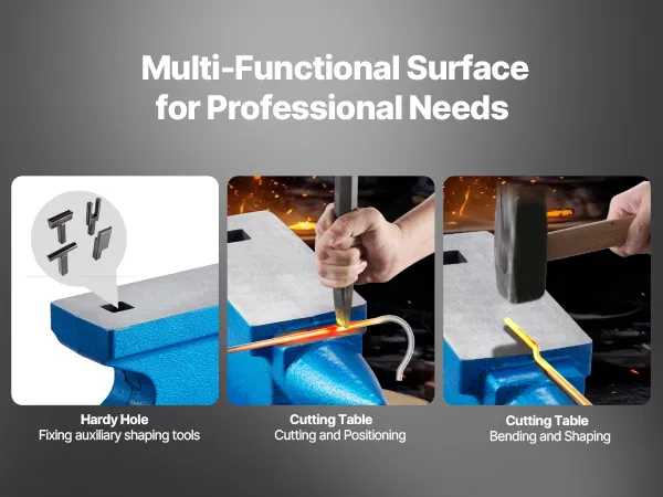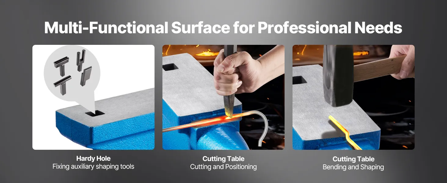 The rounded horn of the cast iron anvil is used for gentle bending and shaping. The square hole can be used for accessories, punching, and bending.