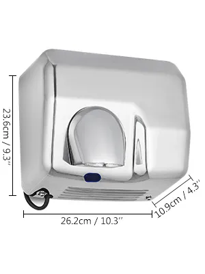 Dies ist ein automatischer Händetrockner, der sowohl für den privaten als auch für den gewerblichen Gebrauch geeignet ist. Es kann Ihre Hände innerhalb von 7-10 Sekunden schnell trocknen und kann auch einfach und frei zwischen heißem und kaltem Wind über einen einfachen Schalterknopf gesteuert werden. Sein modisches Luxusdesign aus rostfreiem Stahl macht es attraktiv und korrosionsbeständig.