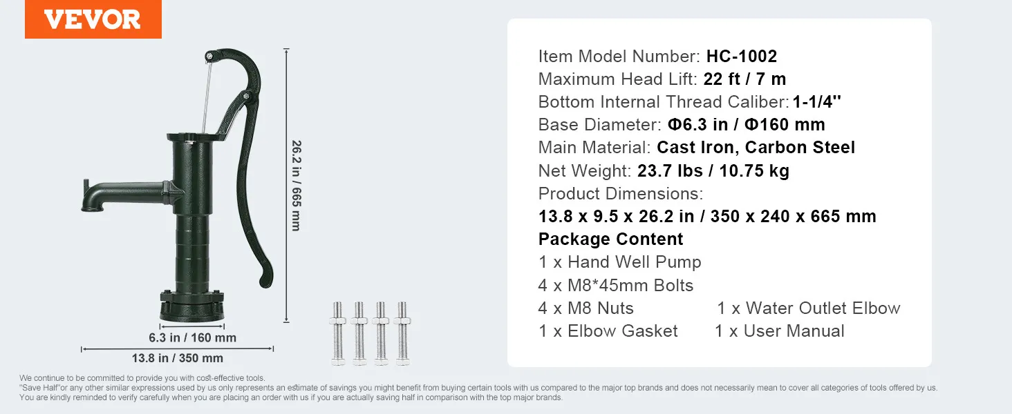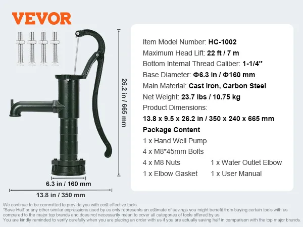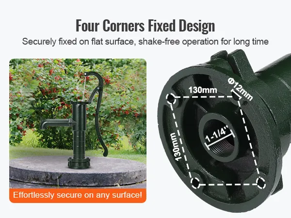 Holen Sie sich sauberes Wasser mit dem zeitlosen Charme der antiken Handwasserpumpe von VEVOR. Diese nützliche und effektive Pumpe kann Wasser bis zu 22 Fuß aus Brunnen pumpen. Da sie keine Energie benötigt, funktioniert sie gut an Orten ohne Strom oder bei Stromausfällen. Ihr starker Gusseisenguss und die rostbeständige Beschichtung sind die Gründe für ihre Langlebigkeit. Die Basis ist robust, um sie stabil zu halten, und der Griff ist einfach. Sie sieht altmodisch aus und ist eine schöne Dekoration für den Garten oder Außenbereich. Diese Brunnenpumpe aus Gusseisen kombiniert Schönheit mit Funktionalität für eine großartige Wasserquelle.
