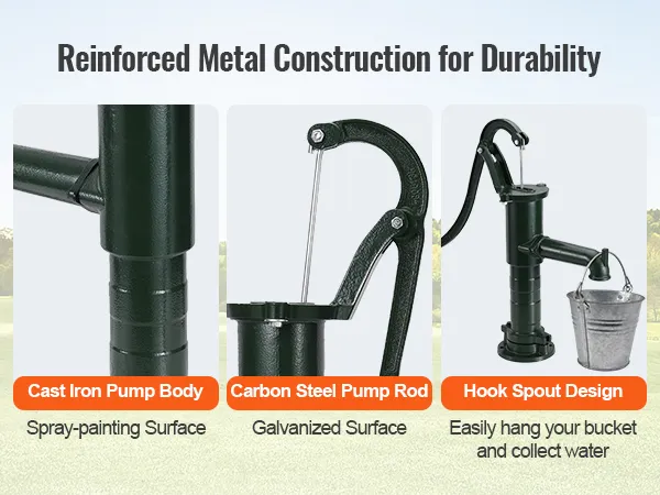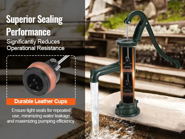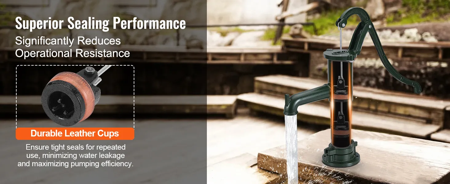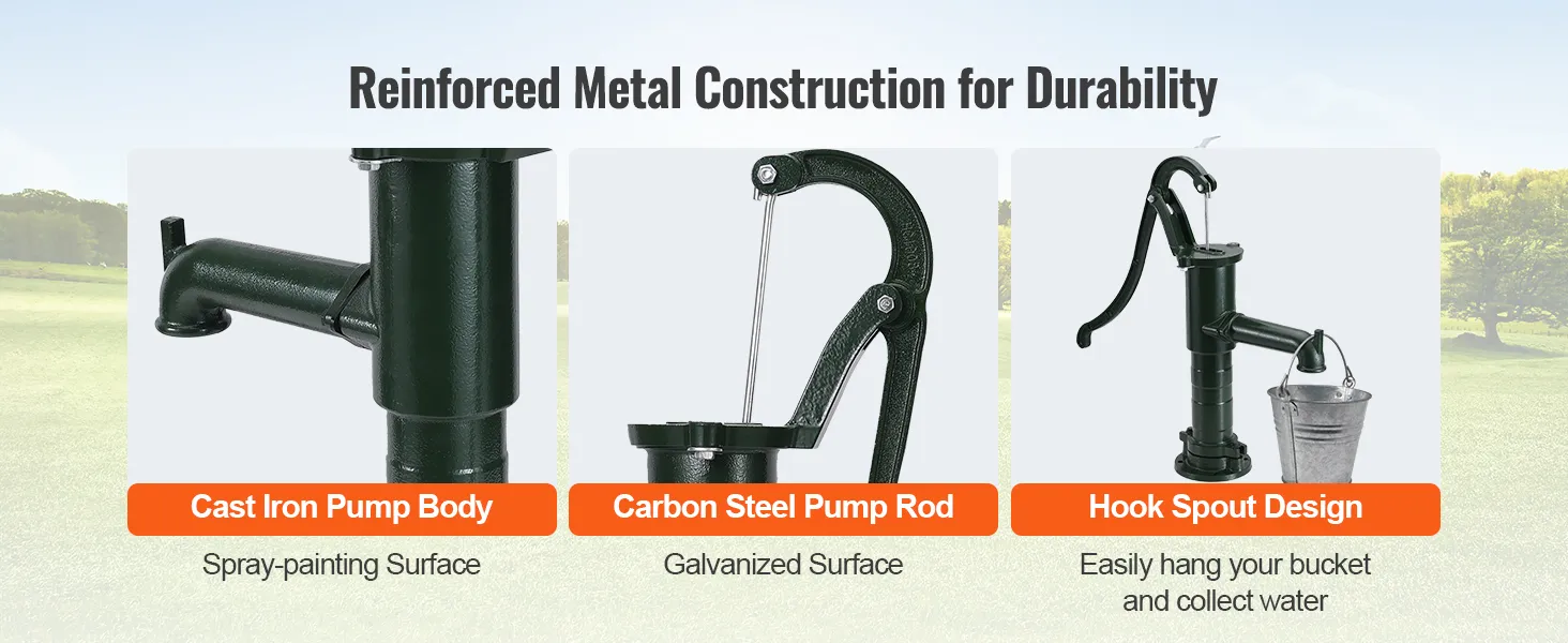 Die antike Handwasserpumpe von VEVOR ist auf Langlebigkeit ausgelegt. Sie besteht aus robustem Gusseisen und ist mit einer rostbeständigen Schicht überzogen. Diese robuste Konstruktion stellt sicher, dass die Pumpe viel Gebrauch und rauem Wetter standhält. Die verdickte Rohrwand ist so ausgelegt, dass sie Stößen standhält, beispielsweise denen eines 20-Pfund-Hammers. Die Pumpe verfügt über spezielle Teile, sogenannte Kugellager, die dicht verschlossen und mit langlebigem Fett gefüllt sind. Diese Brunnenpumpe aus Gusseisen ist außerdem mit einer speziellen Isolierung geschützt, die dafür sorgt, dass sie auch unter heißen oder rauen Bedingungen gut funktioniert.