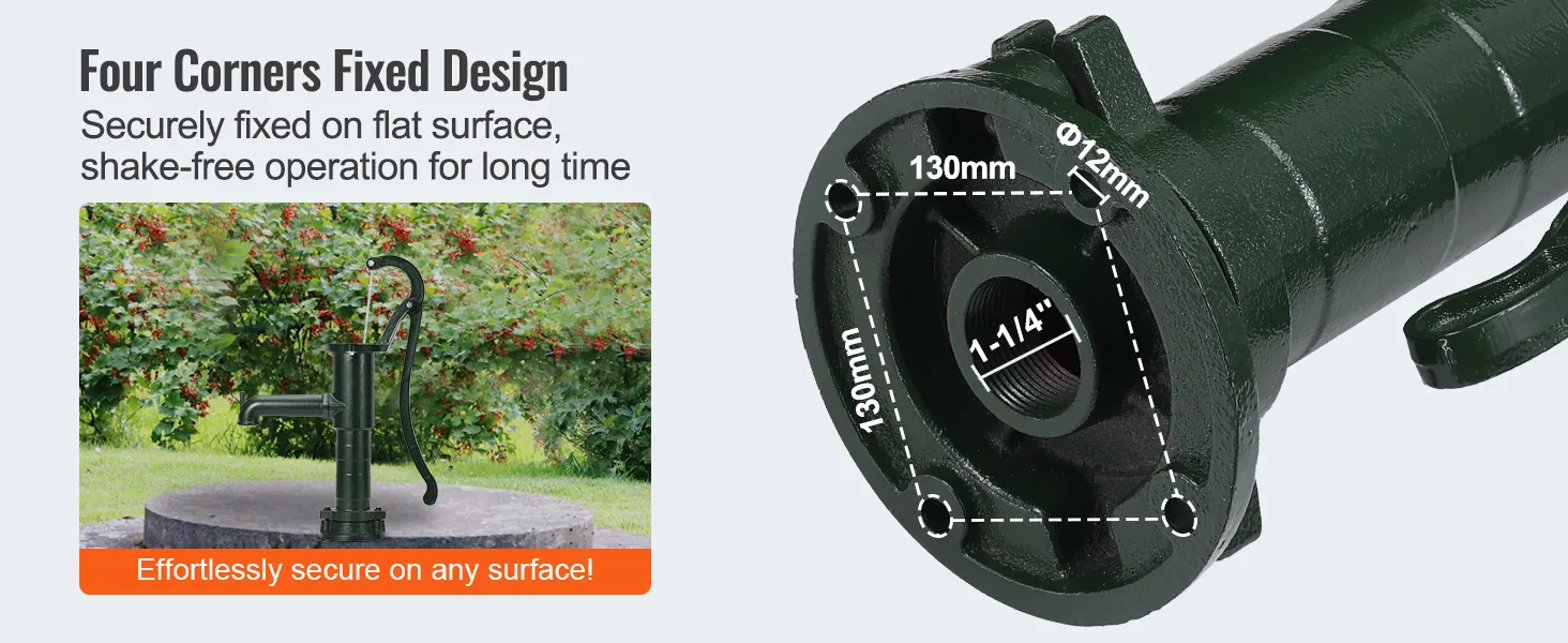 Diese Brunnenpumpe aus Gusseisen ist für eine einfache und bequeme Bedienung konzipiert. Ihr Griff ist so konzipiert, dass Sie ohne große Anstrengung und ohne Ermüdung Wasser pumpen können. Das bedeutet, dass Sie die Pumpe auch über einen langen Zeitraum bequem verwenden können. Diese Handpumpe für den Garten hat außerdem einen starken Sockel, der an Ort und Stelle bleibt. Sie können sie mit nur wenigen Schrauben an verschiedenen Oberflächen befestigen. Dadurch bleibt die Pumpe stabil und bewegt sich während der Verwendung nicht, sodass Sie zuverlässig Wasser bekommen.
