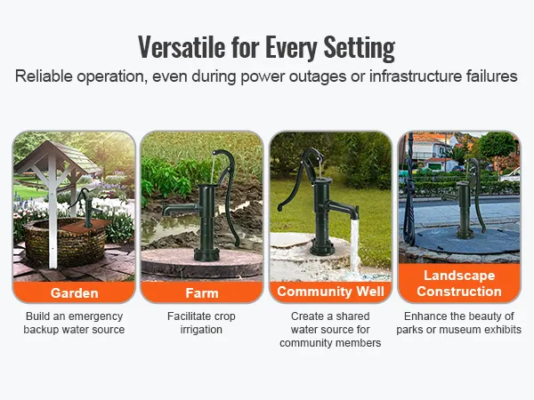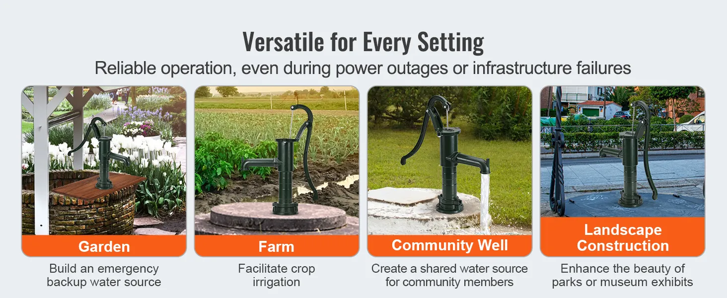 Die Vielseitigkeit der antiken Handwasserpumpe von VEVOR macht sie für verschiedene Anwendungen geeignet. Ob Sie Pflanzen in Ihrem Garten gießen, Vieh mit Wasser versorgen oder dekorative Wasserspiele schaffen möchten, diese Pumpe passt sich Ihren Bedürfnissen an. Sie ist ideal für Familiengärten und Felder und sogar als funktionale Ergänzung zur Außendekoration. Das innovative hakenförmige Ausgussdesign ermöglicht das einfache Aufhängen des Eimers und vereinfacht so die Wasserentnahme. Diese altmodische Krugpumpe erfüllt verschiedene Anforderungen und ist damit eine wertvolle Ergänzung für jede Umgebung.