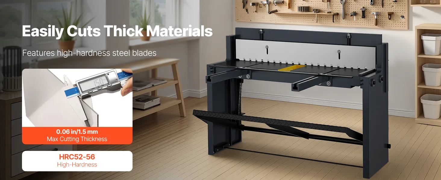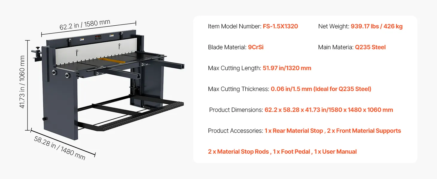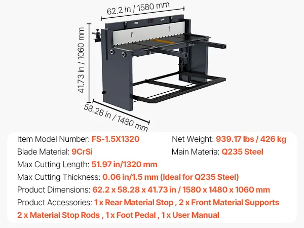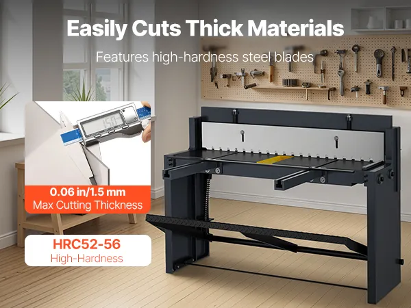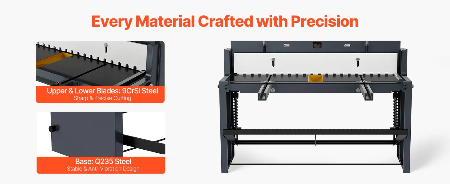 Leistungsstarke Schneidleistung: Mit einer maximalen Schnittlänge von 1320 mm, einer Dicke von 1,5 mm und einer Rundstahlkapazität von 1,27 mm schneidet diese Schere mühelos große Materialien. Die Klingen aus 9CrSi-Siliziumstahl mit einer Härte von HRC52-54 sorgen für scharfe, gratfreie Schnitte.