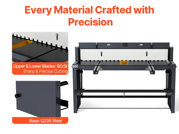 Unser Cutter besteht aus Ober- und Unterklingen aus 9CrSi-Stahl sowie einer Rundklinge aus 9CrSi, die für höchste Schärfe auf HRC52–54 wärmebehandelt sind. Er ist robust und kantenrollbeständig. Der Rahmen und die Basis aus Q235-Stahl bieten stabilen Halt, reduzieren Vibrationen und sorgen für saubere, präzise Schnitte – jedes Mal.