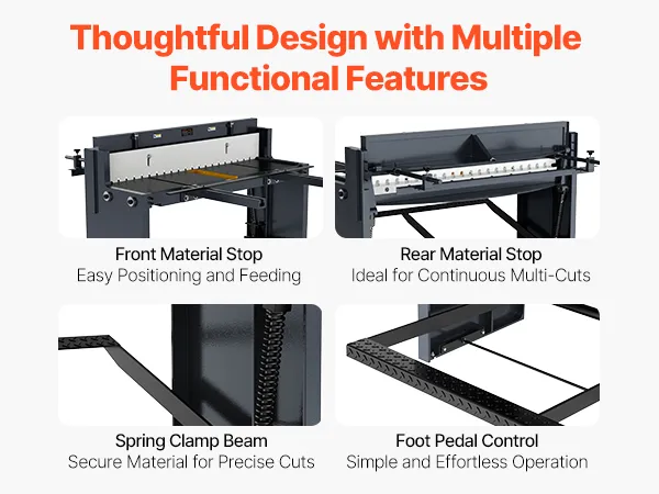 Unsere Blechschere verfügt über eine Fußpedalsteuerung für einen zuverlässigeren und effizienteren Betrieb. Die vorderen und hinteren Materialanschläge gewährleisten eine präzise Materialpositionierung und ermöglichen Mehrfachschnitte. Der federbetätigte Niederhalterbalken hält das Material sicher und erleichtert so den täglichen Gebrauch.