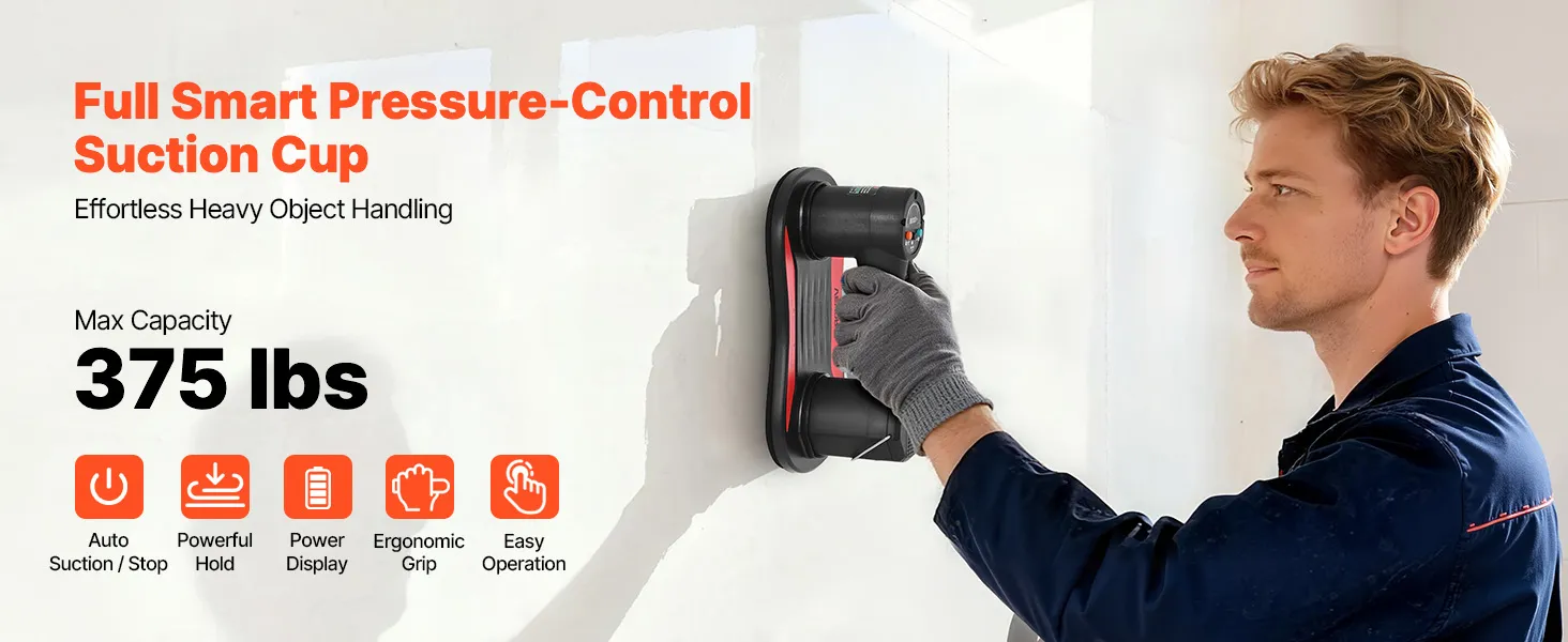 Professioneller elektrischer Saugnapf: Dieser intelligente Saugnapfheber pumpt automatisch nach, um das Vakuum auf flachen, sauberen, glatten und nicht porösen Oberflächen aufrechtzuerhalten. Er hilft Ihnen, Glas, Fliesen, Kunststoff, Metallplatten und Stein sicher anzuheben.