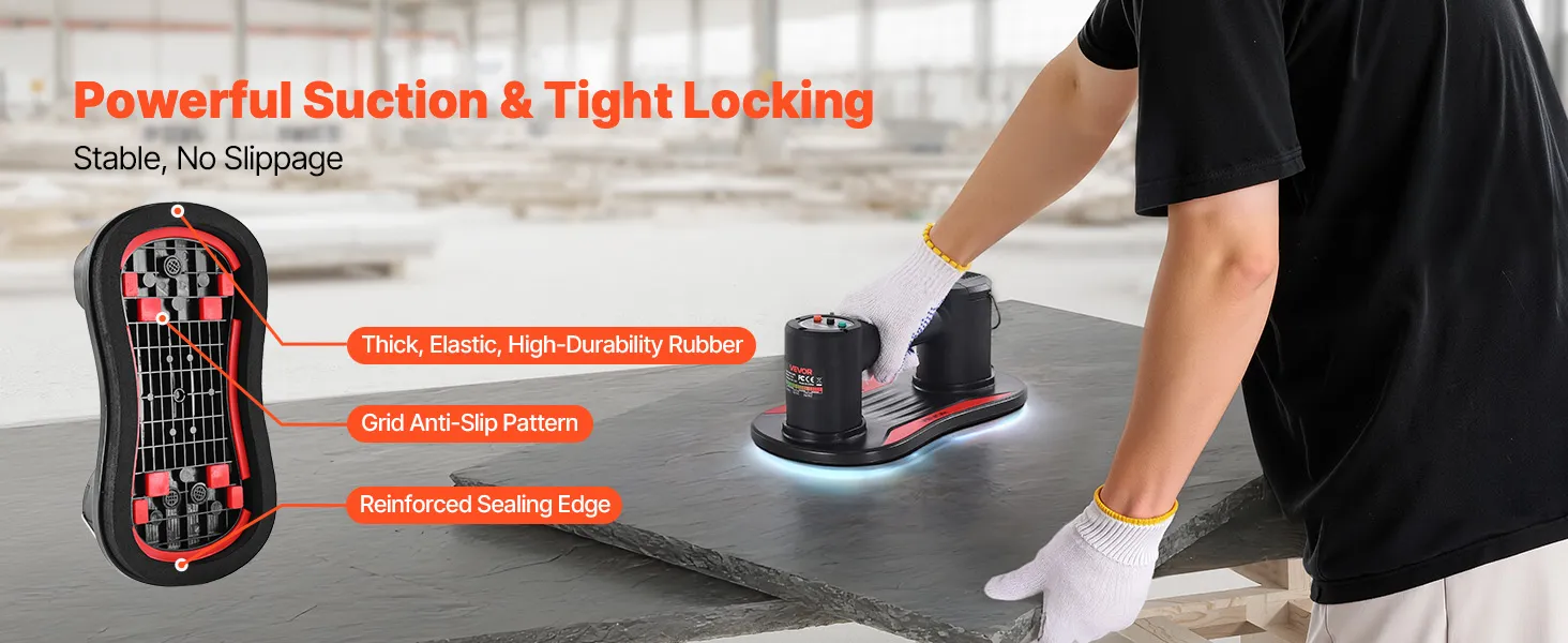 Dieser Saugnapfheber bietet festen Halt durch hohen Unterdruck. Das Pad bleibt auch bei leichten Vibrationen oder leichten Neigungen an Ort und Stelle, sodass schwere Platten stabil bleiben und eine sichere Handhabung gewährleistet ist.